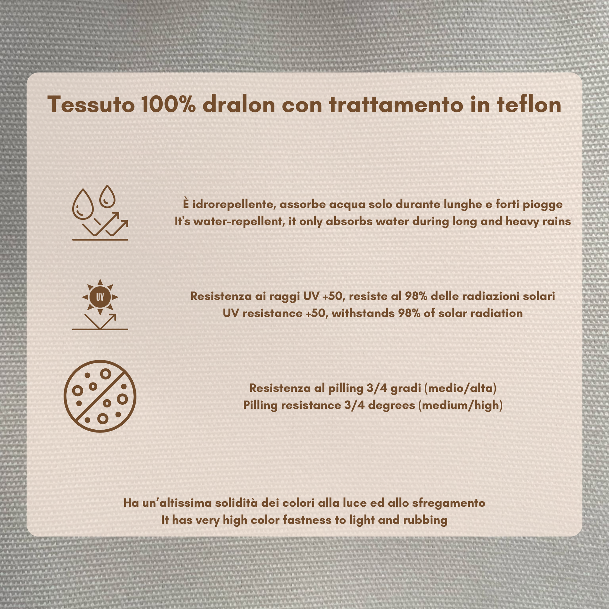 *Il dralon è realizzato in fibra acrilica, molto simile al filato di cotone, non è plastificato al tatto ed è reso dal trattamento in teflon idrorepellente, resistente a sporco e usura.