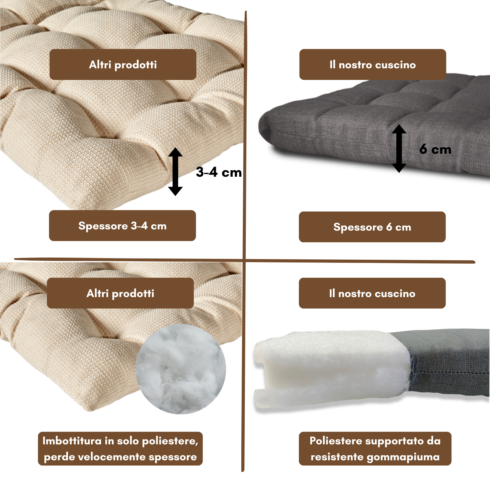 Imbottitura: gommapiuma 18 kg/mc rivestita con acrilico;