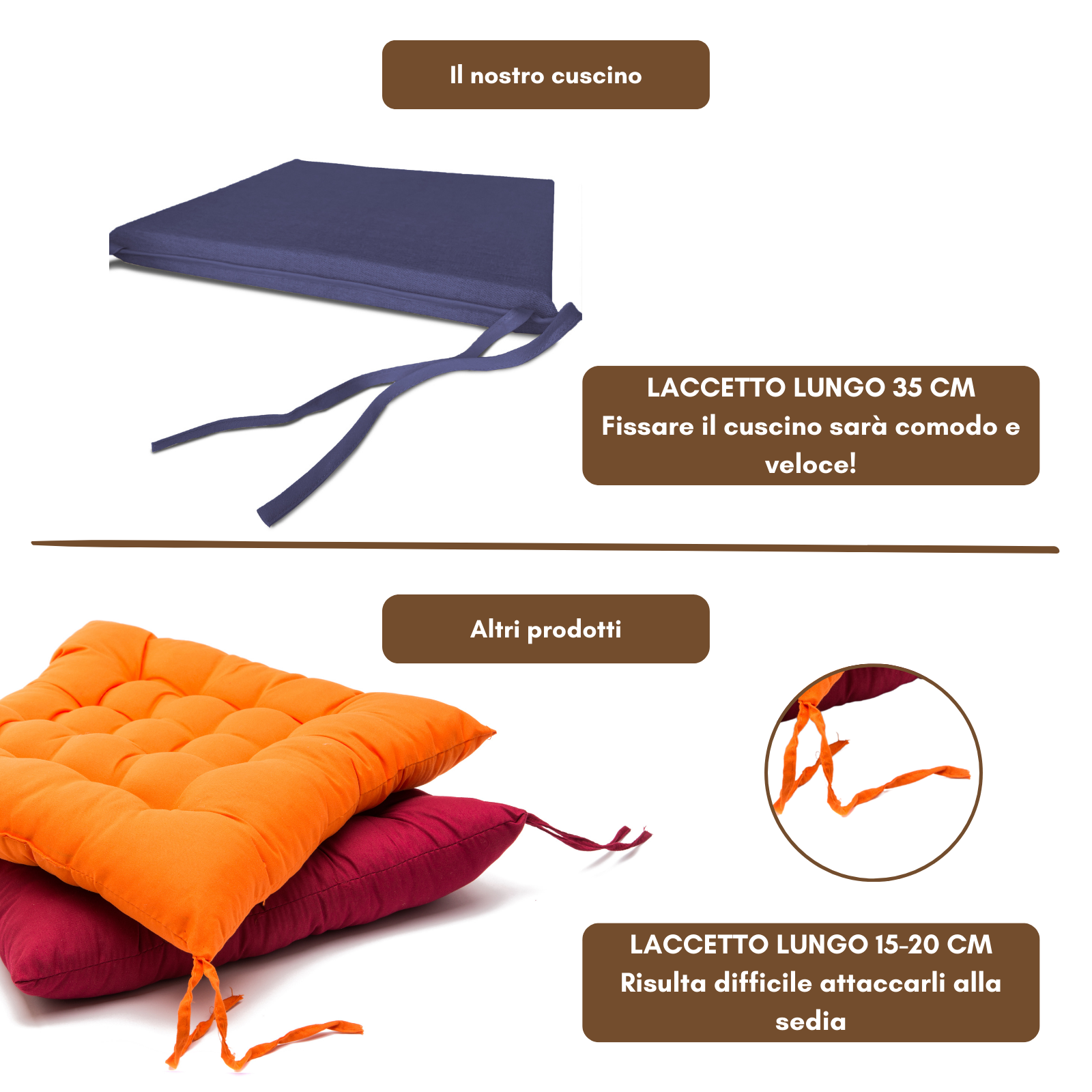 Fissaggio: puoi fissarlo alla sedia grazie alle due coppie di lacci poste posteriormente al cuscino.