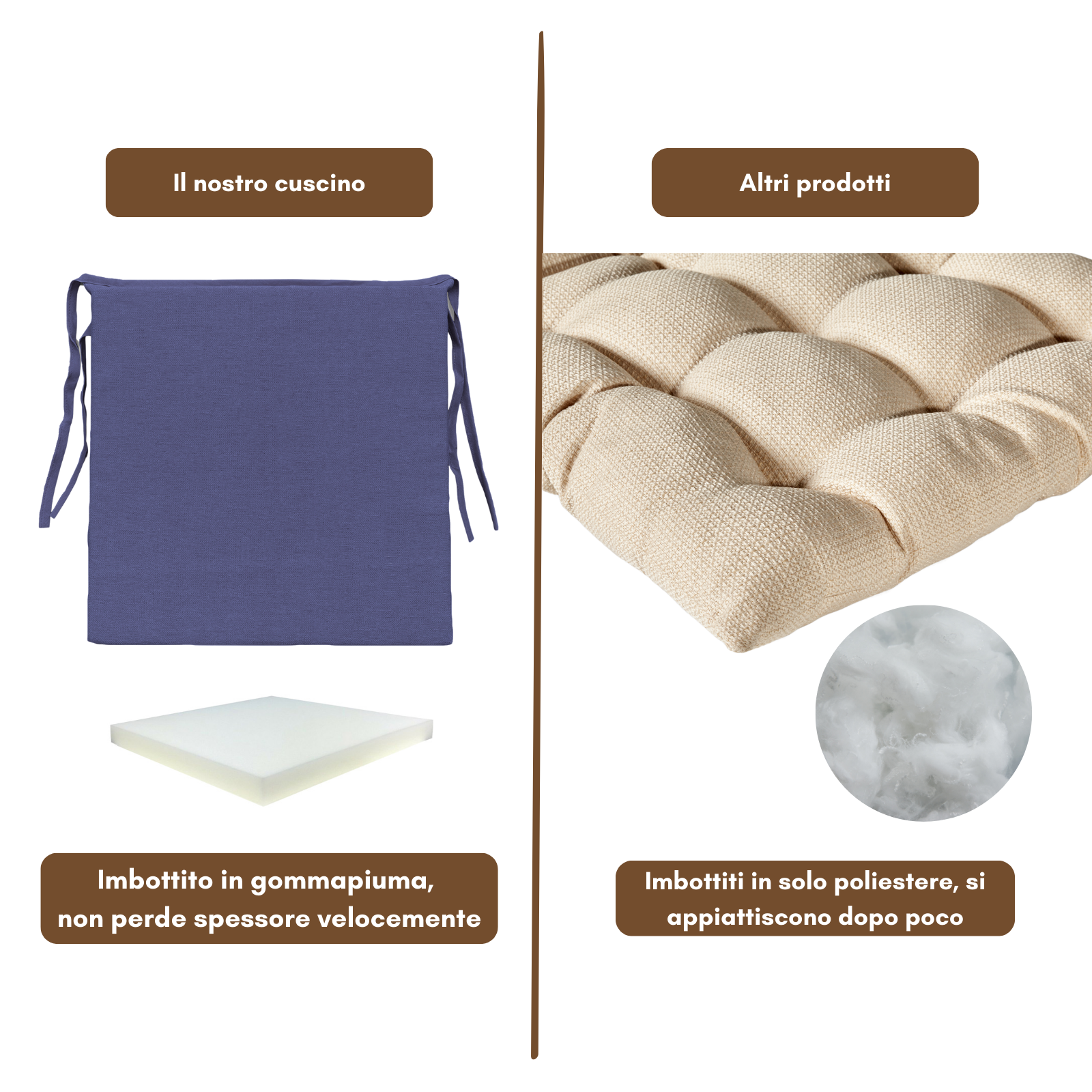 I cuscini sono presentano un'imbottitura in poliuretano espanso (gommapiuma o spugna) comodo e resistente.