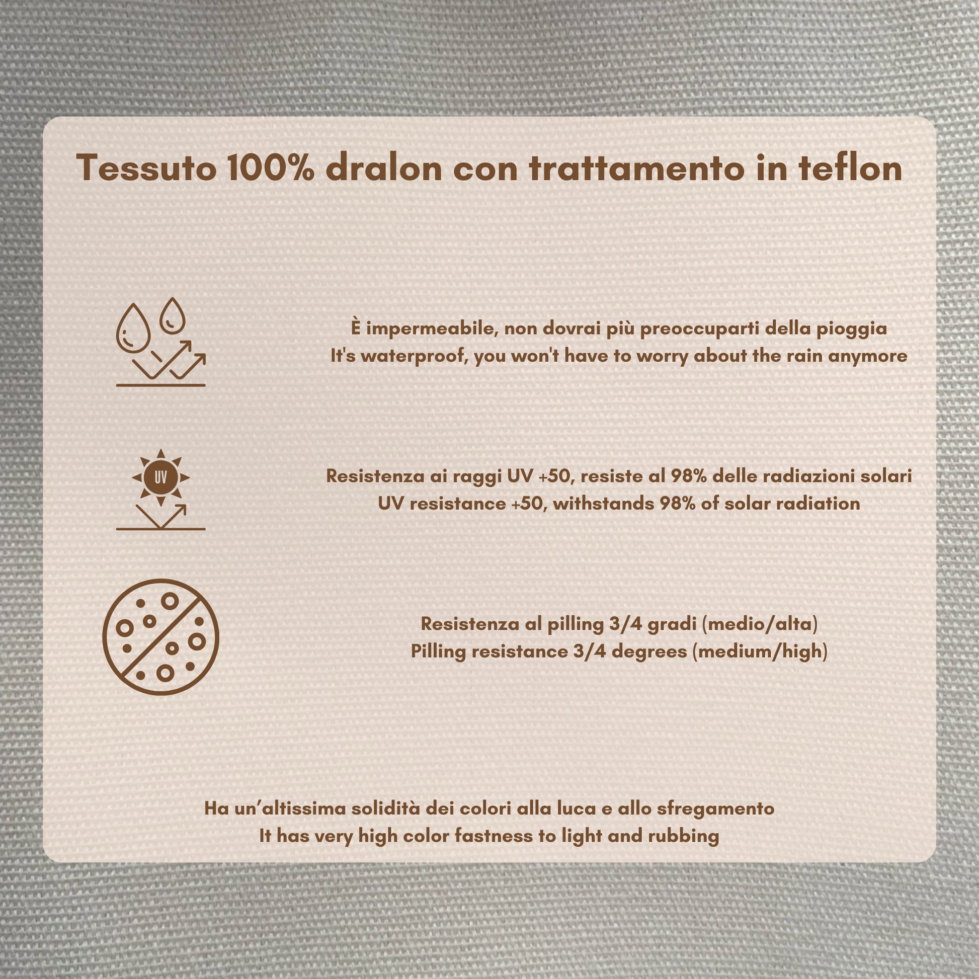 Tessuto: 100% dralon con trattamento in teflon