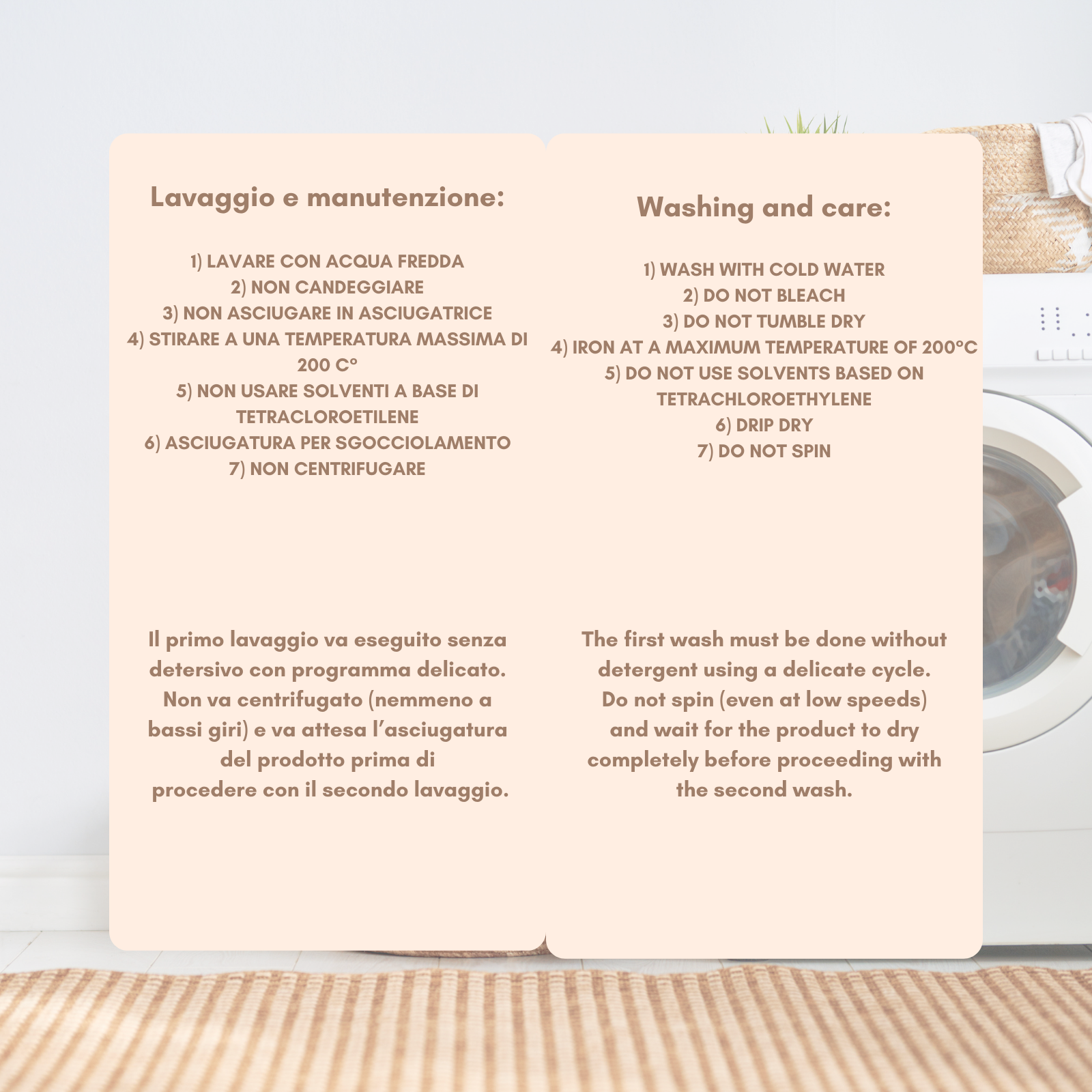 Istruzioni di lavaggio: Lavabile in lavatrice a 30° (prevede un deterioramento più veloce) o a mano con un panno morbido, acqua tiepida e un pò di detersivo;