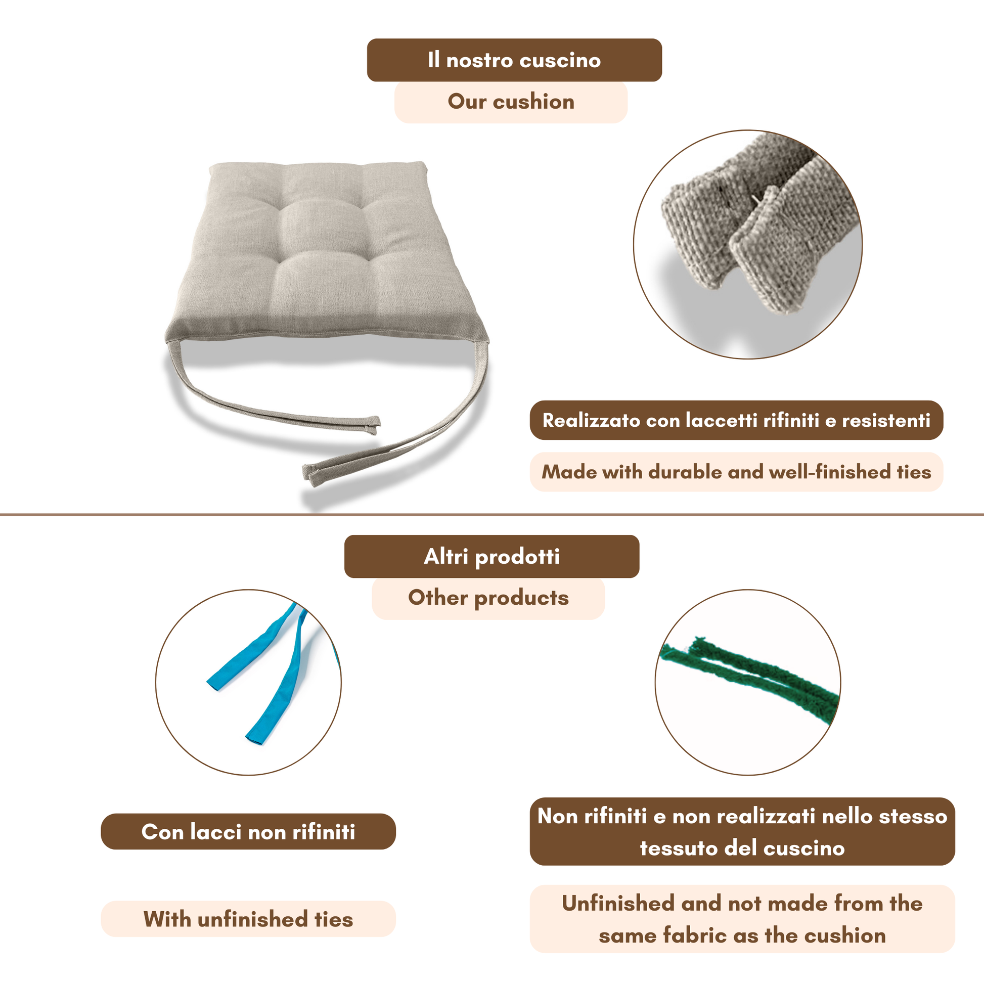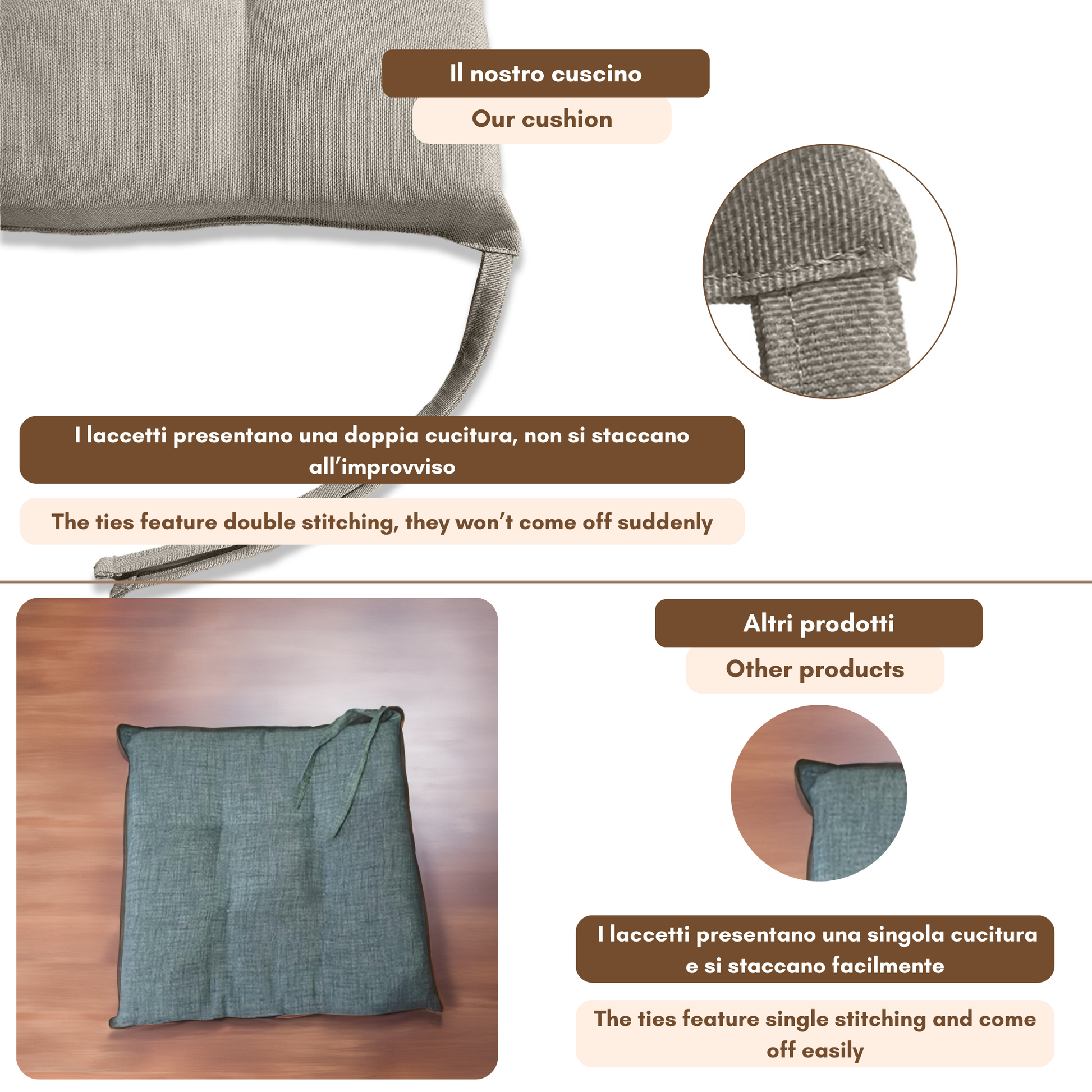 Fissaggio: puoi fissarlo alla sedia grazie alle due coppie di lacci poste posteriormente al cuscino.