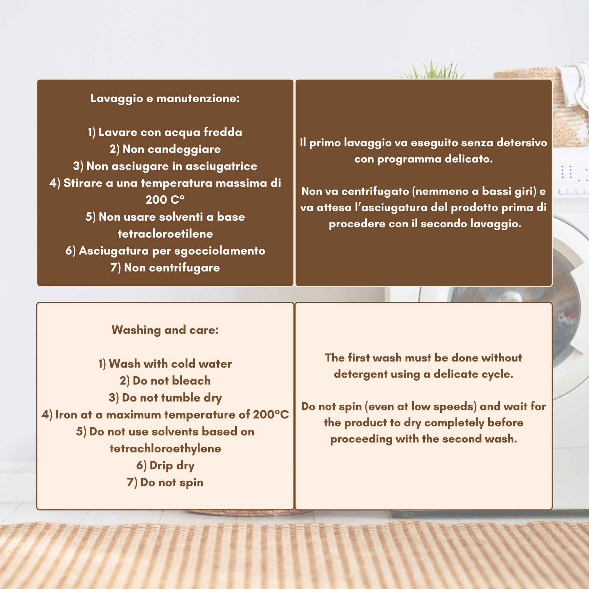 Istruzioni di lavaggio: Lavabile in lavatrice a 30° (prevede un deterioramento più veloce) o a mano con un panno morbido, acqua tiepida e un pò di detersivo;