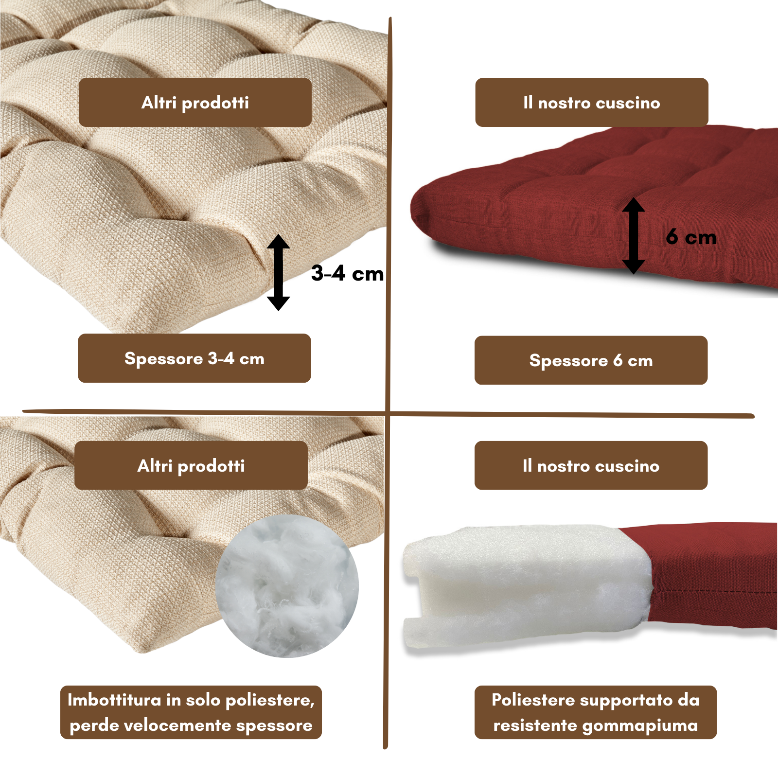 Imbottitura: gommapiuma 18 kg/mc rivestita con acrilico;