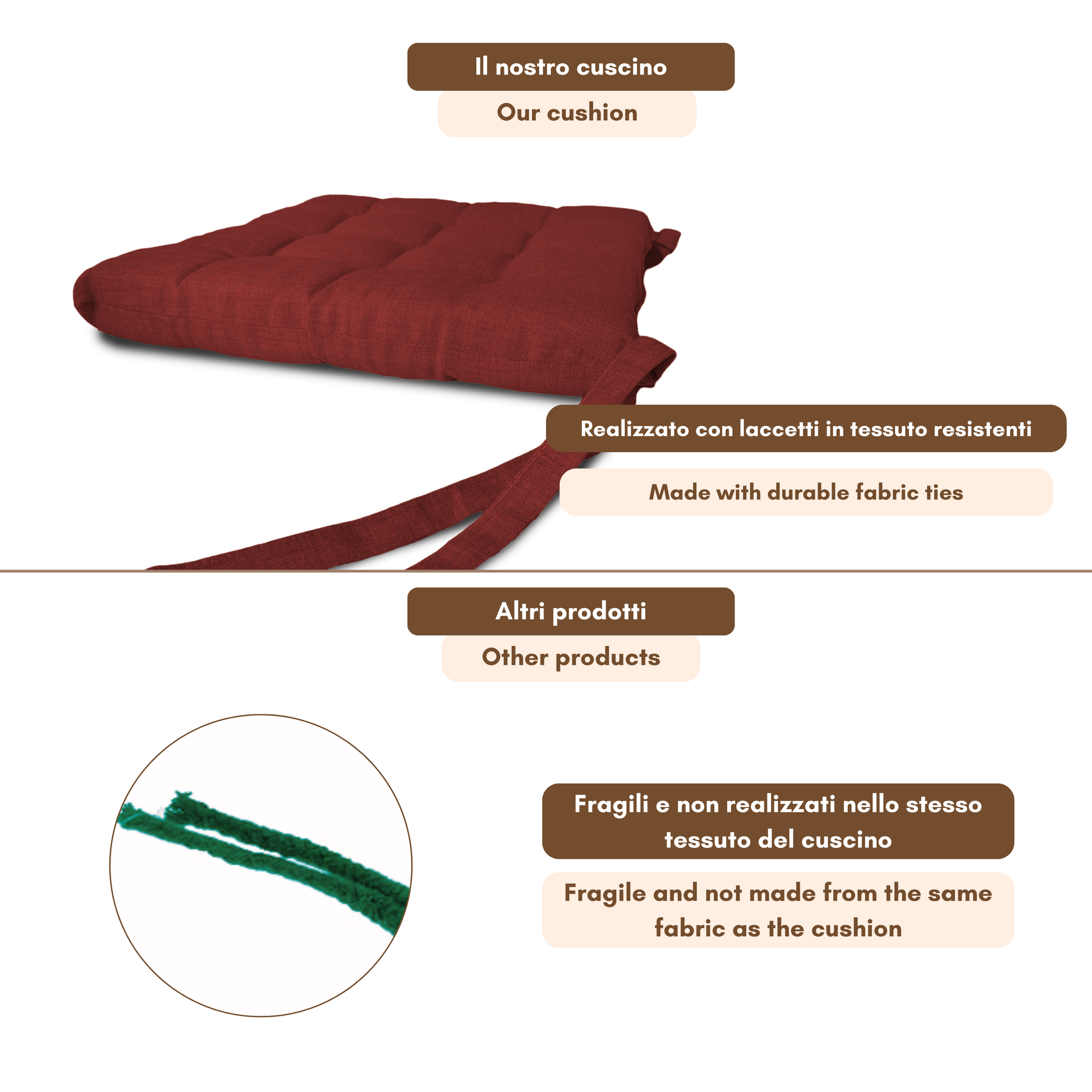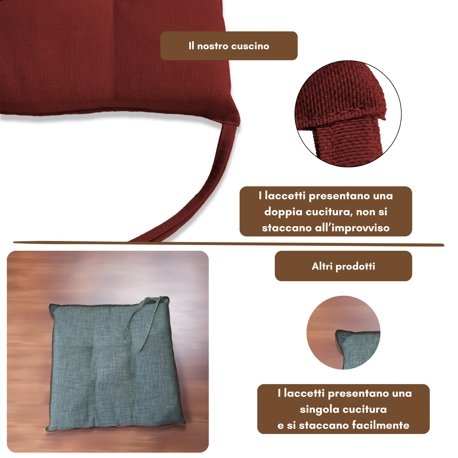 Fissaggio: puoi fissarlo alla sedia grazie alle due coppie di lacci poste posteriormente al cuscino.