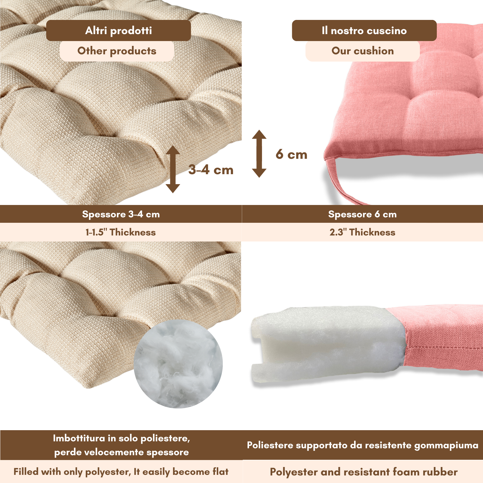 Imbottitura: gommapiuma 18 kg/mc rivestita con acrilico;