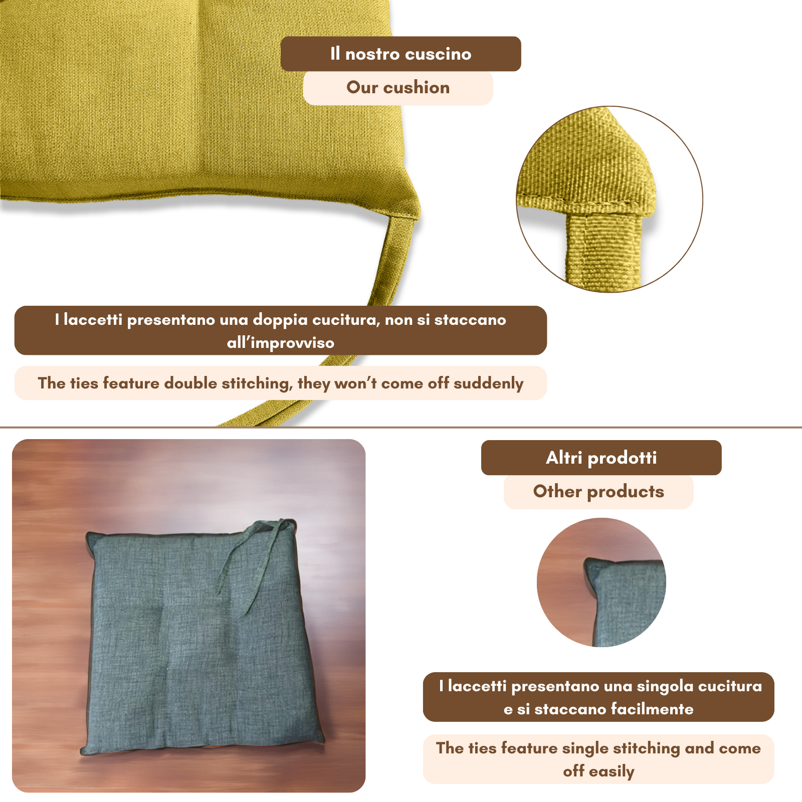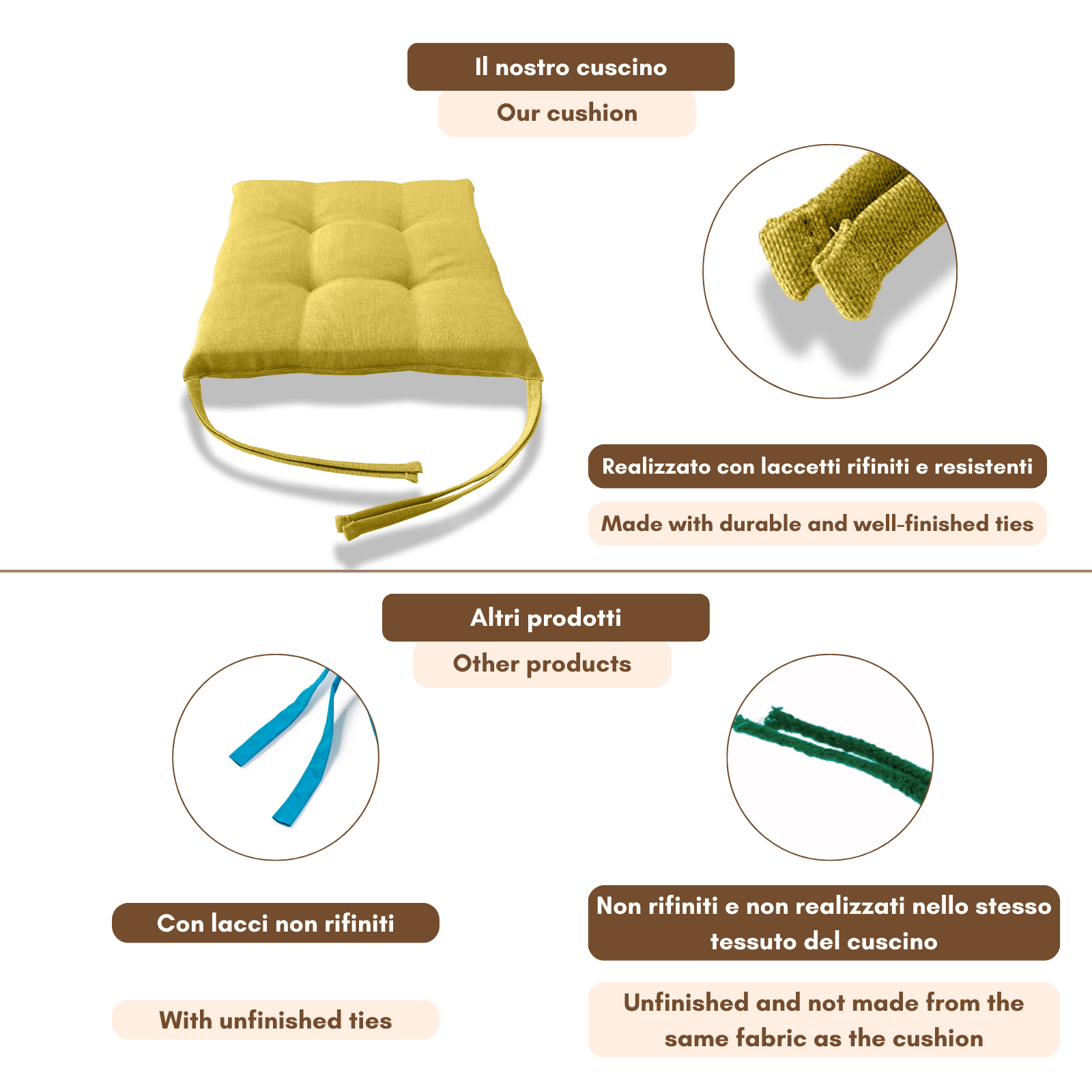 Fissaggio: puoi fissarlo alla sedia grazie alle due coppie di lacci poste posteriormente al cuscino.