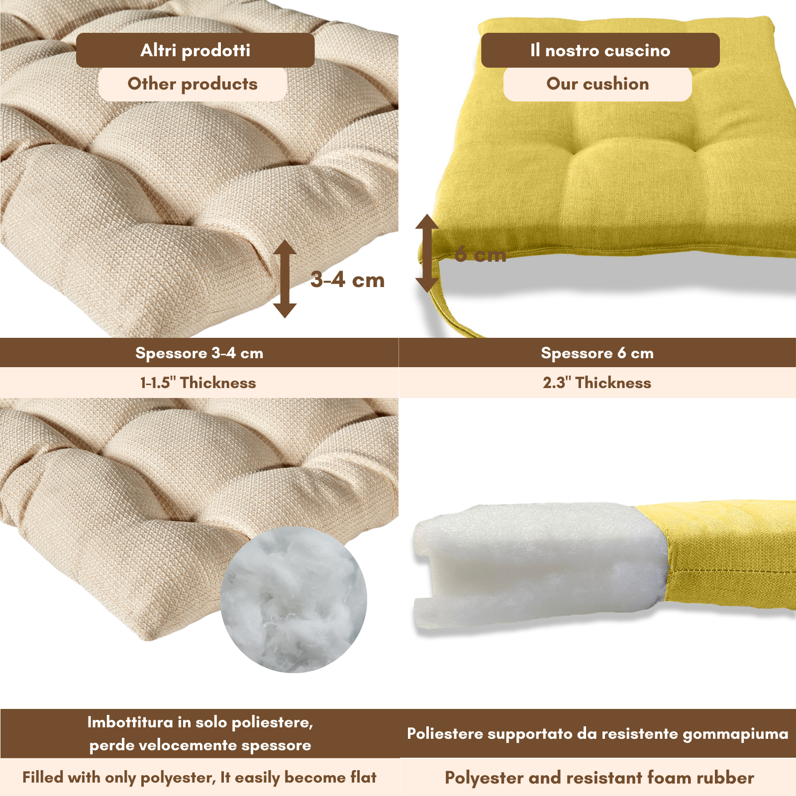 Imbottitura: gommapiuma 18 kg/mc rivestita con acrilico;