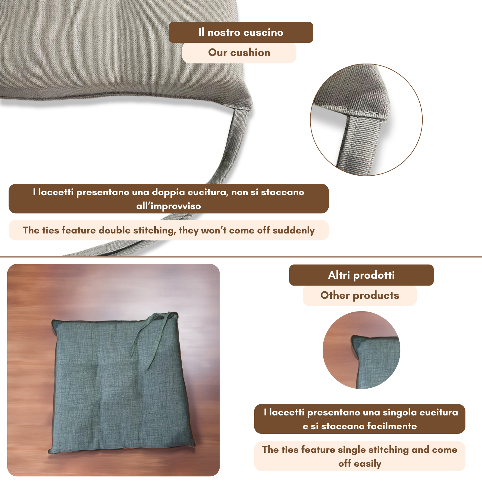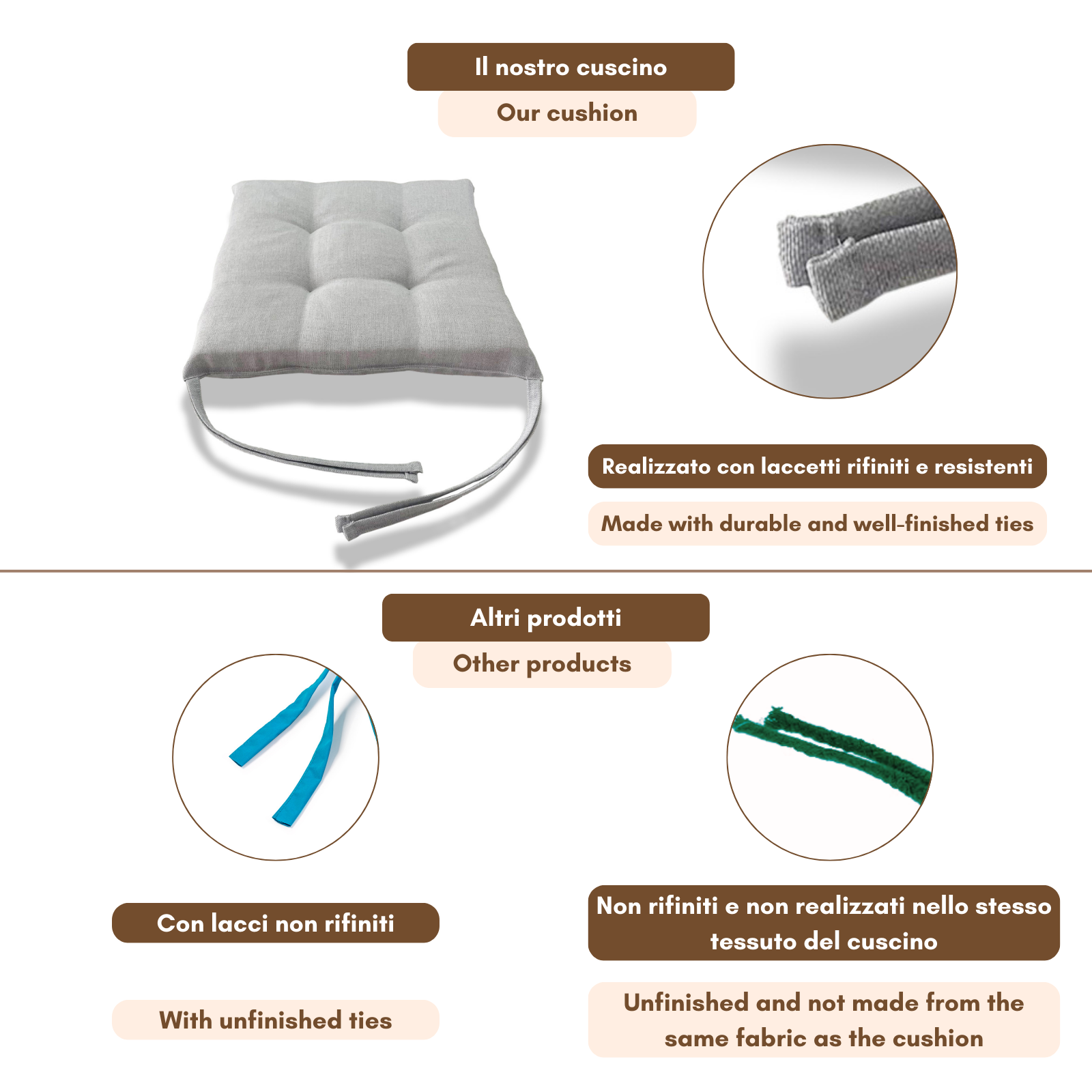 Fissaggio: puoi fissarlo alla sedia grazie alle due coppie di lacci poste posteriormente al cuscino.