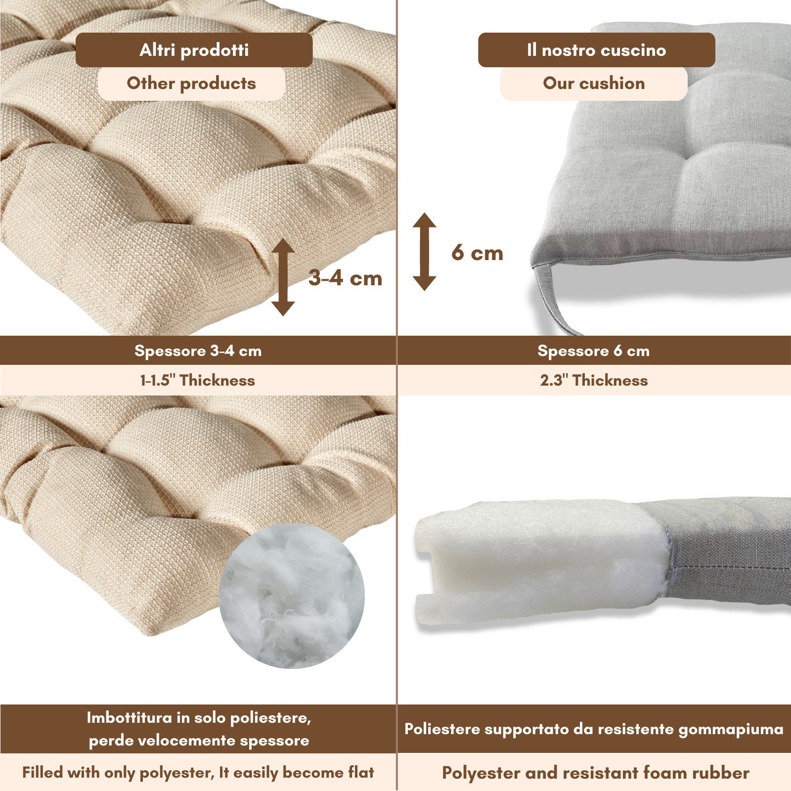 Imbottitura: gommapiuma 18 kg/mc rivestita con acrilico;