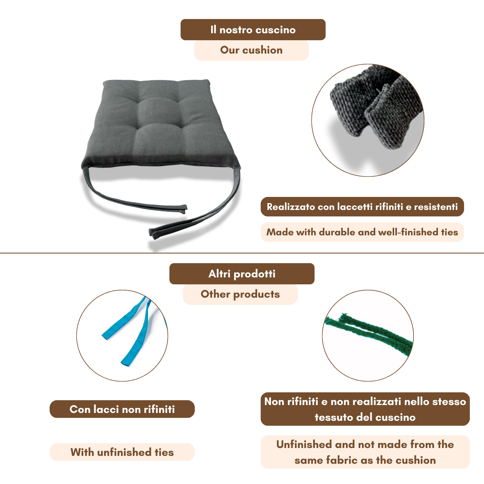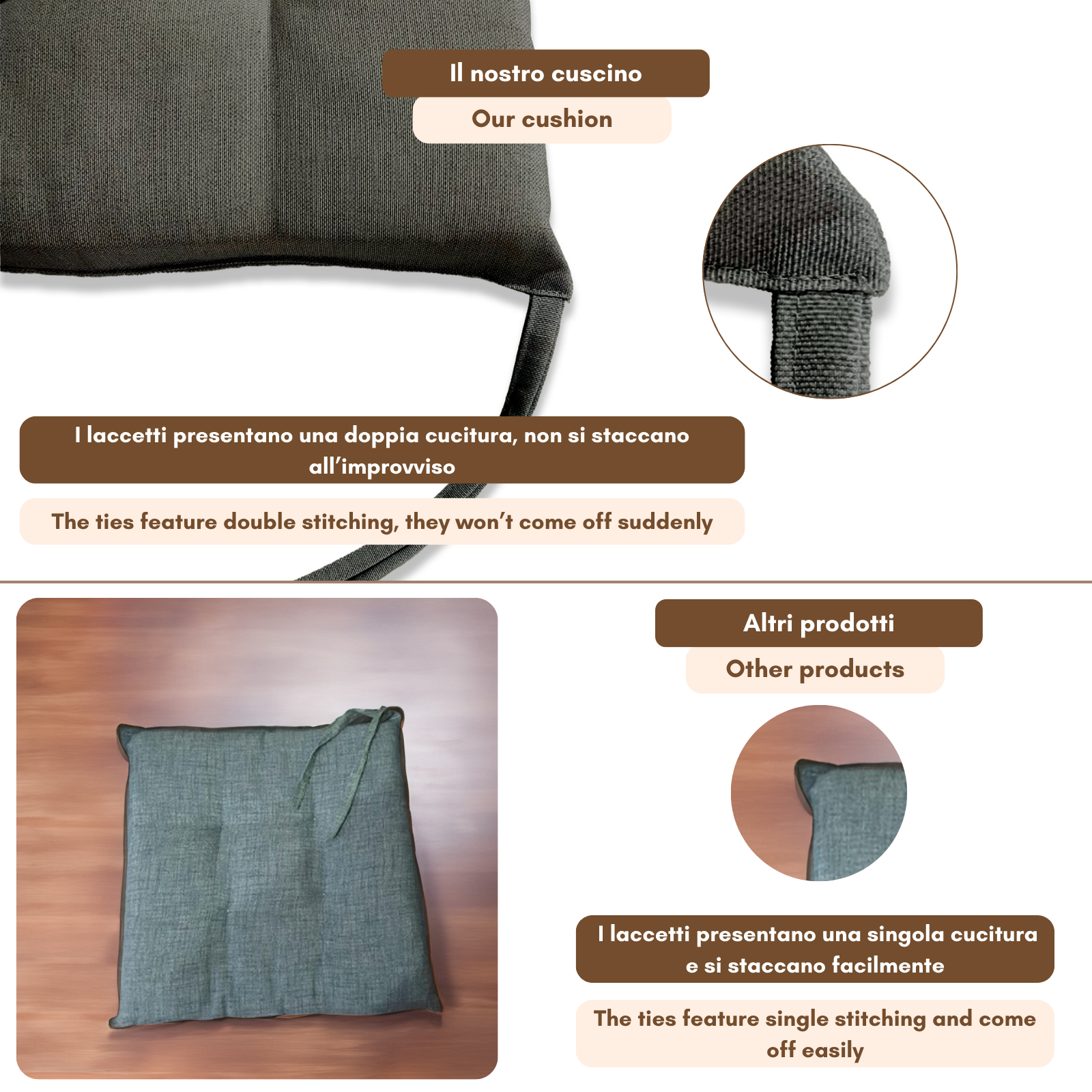 Fissaggio: puoi fissarlo alla sedia grazie alle due coppie di lacci poste posteriormente al cuscino.