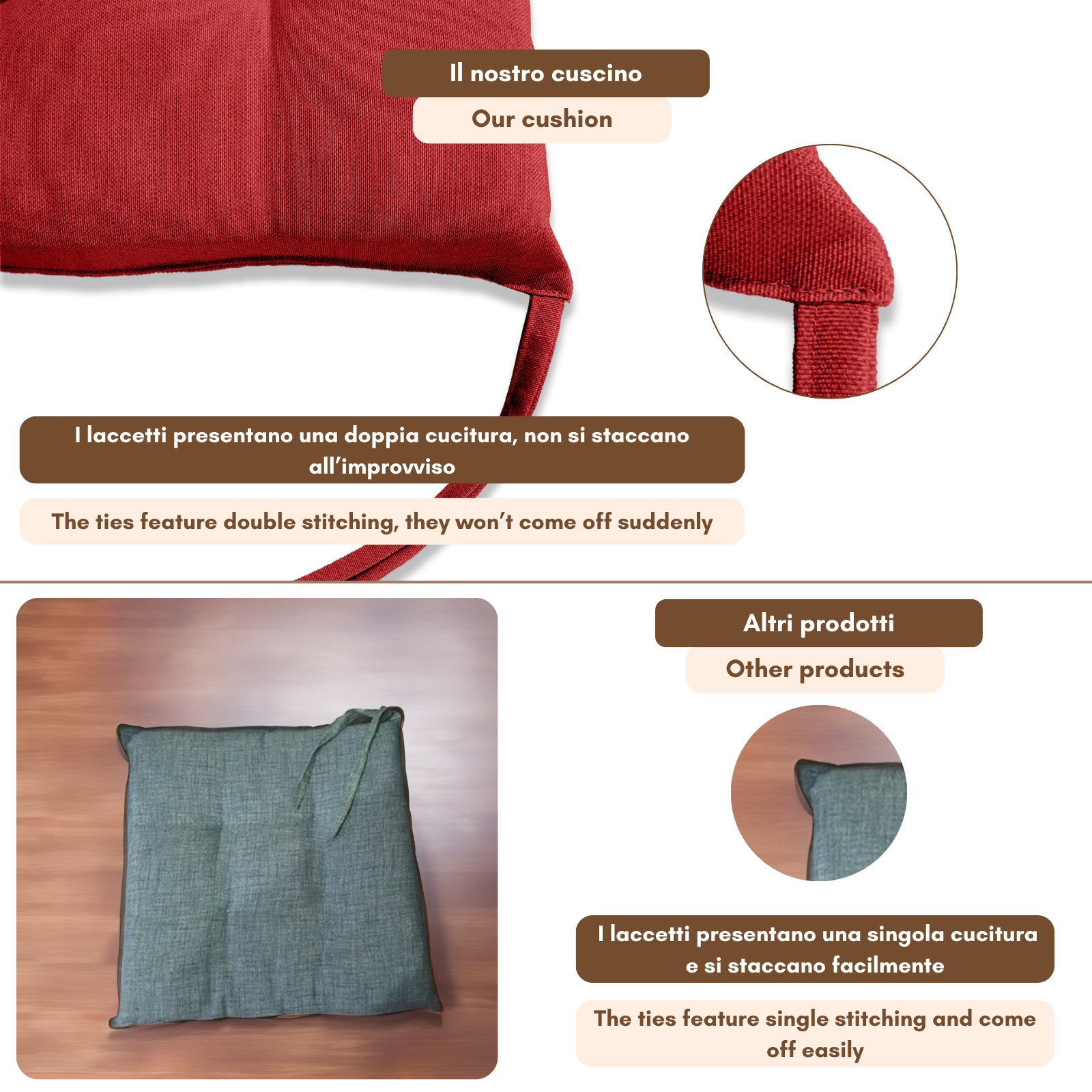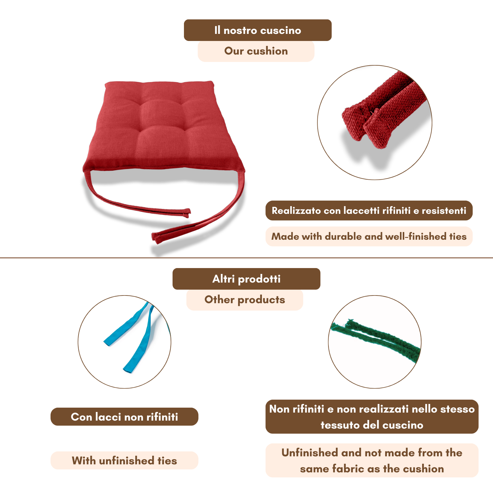 Fissaggio: puoi fissarlo alla sedia grazie alle due coppie di lacci poste posteriormente al cuscino.