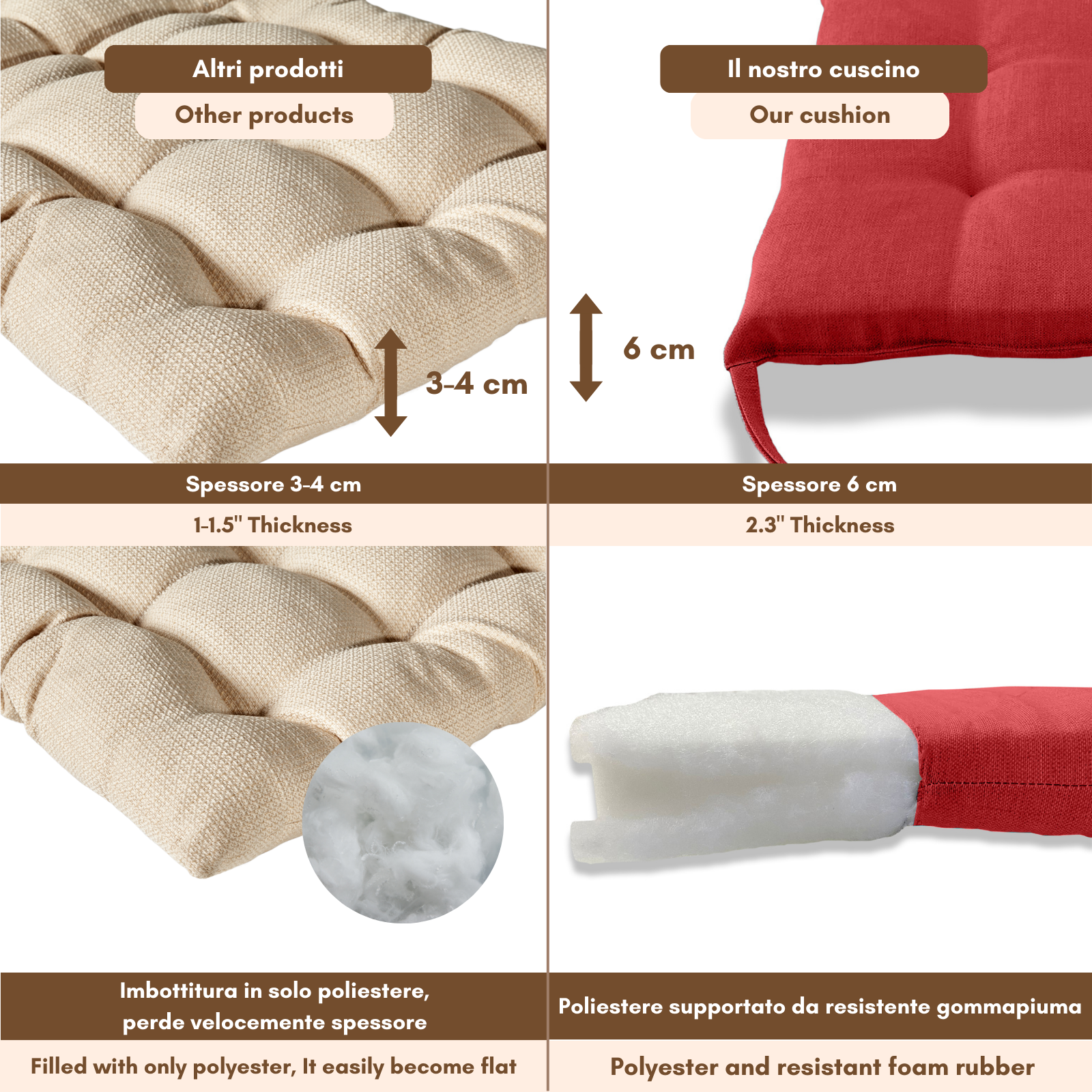 Imbottitura: gommapiuma 18 kg/mc rivestita con acrilico;