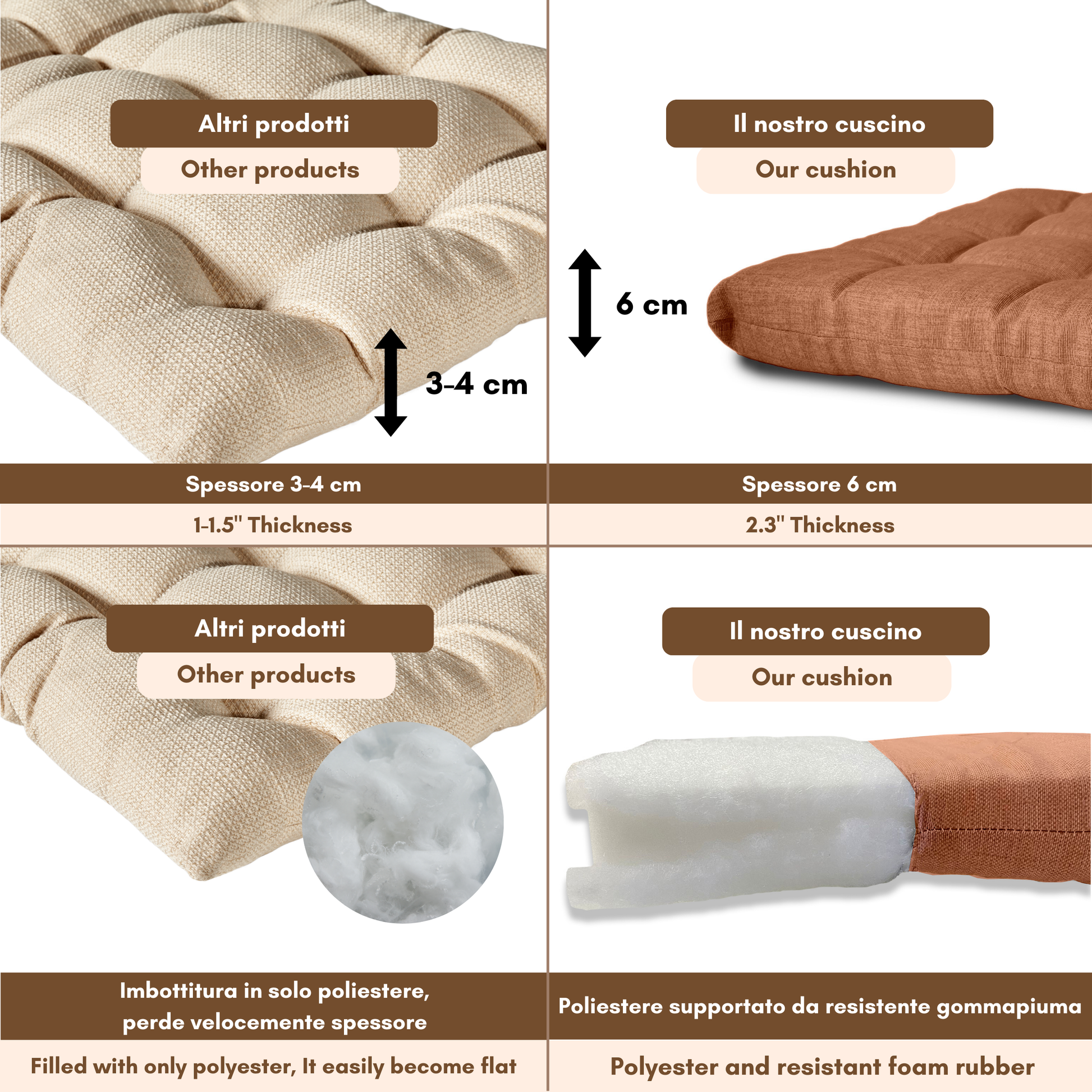 Imbottitura: gommapiuma 18 kg/mc rivestita con acrilico;