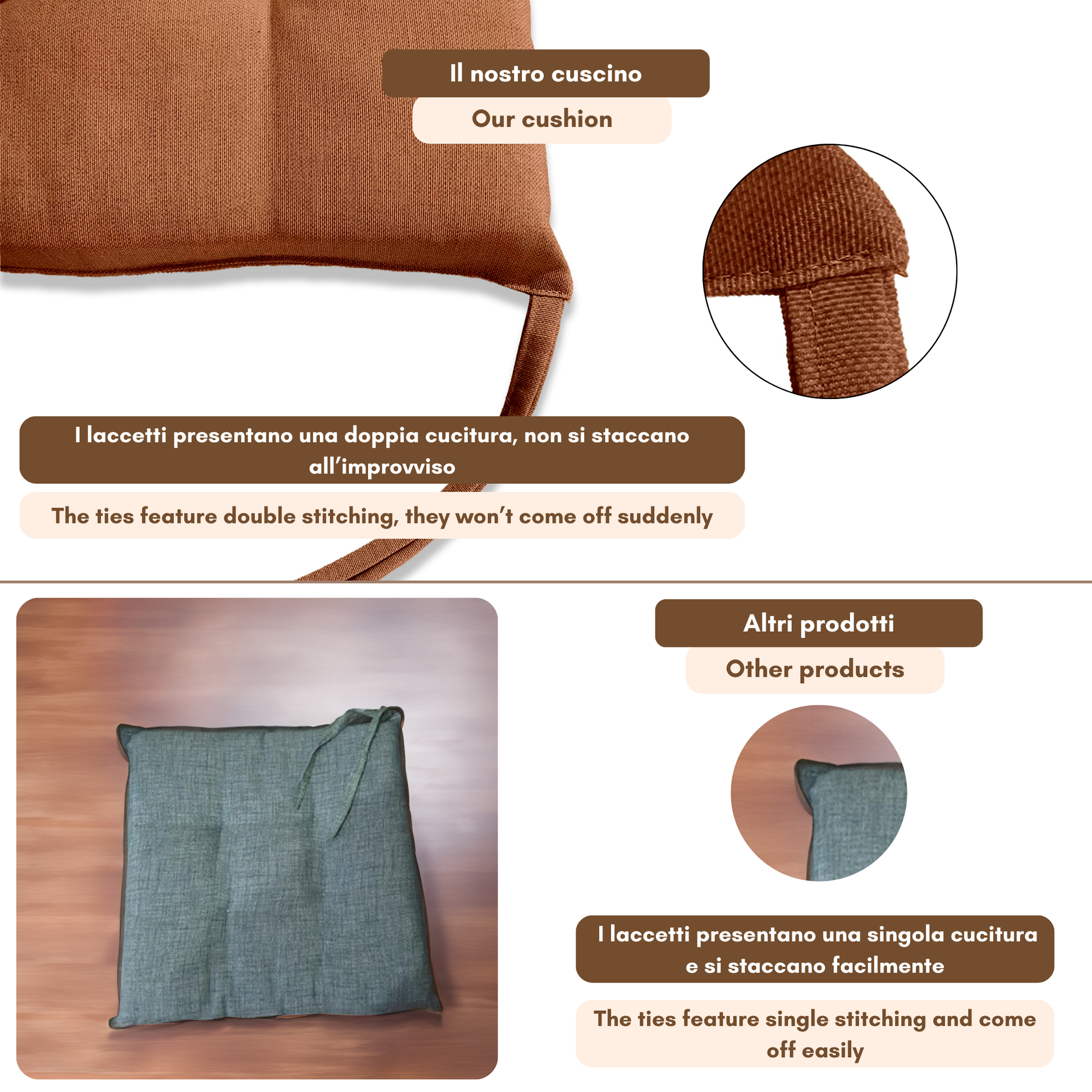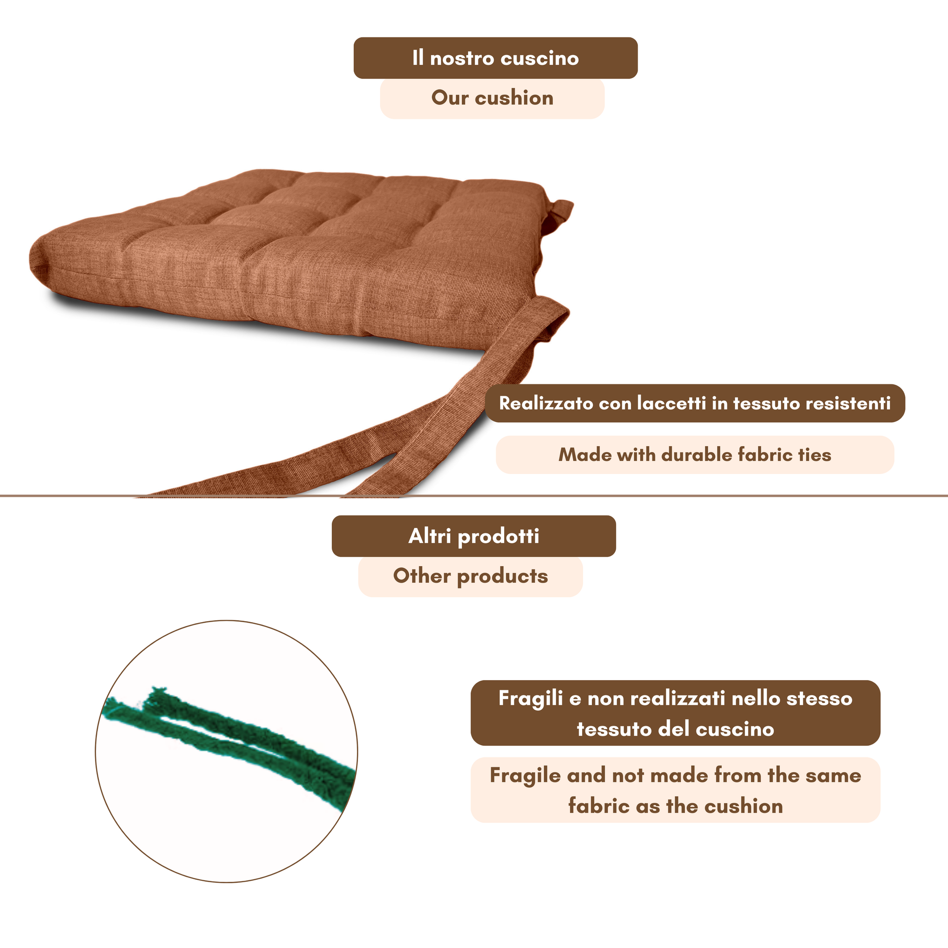 Fissaggio: puoi fissarlo alla sedia grazie alle due coppie di lacci poste posteriormente al cuscino.