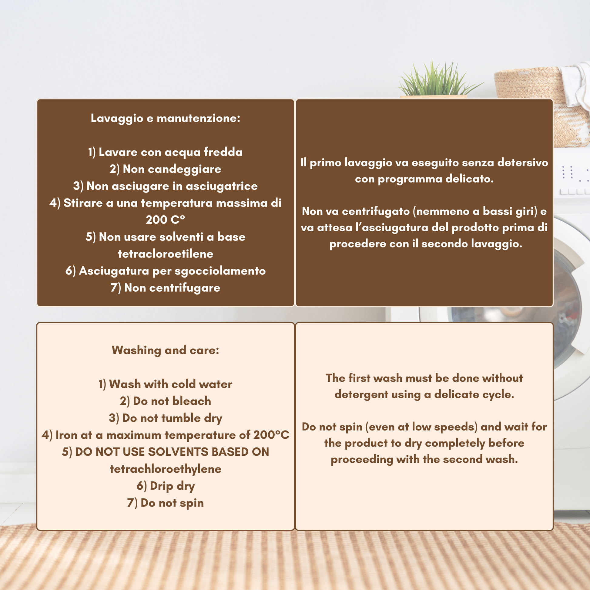 Istruzioni di lavaggio: Lavabile in lavatrice a 30° (prevede un deterioramento più veloce) o a mano con un panno morbido, acqua tiepida e un pò di detersivo;