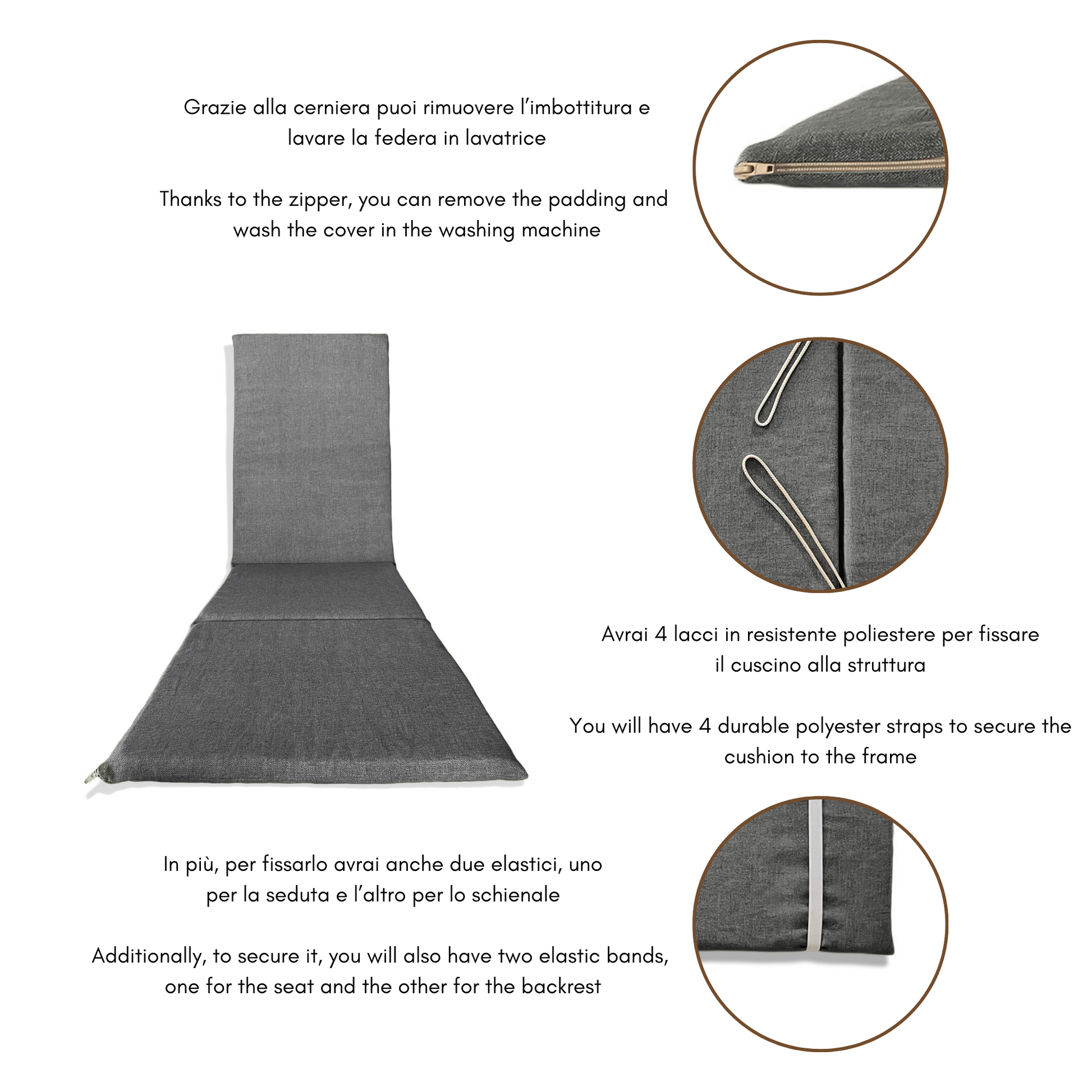 Fissaggio: due coppie di lacci poste tra seduta e schienale e due bande elastiche alle estremità di seduta e schienale;