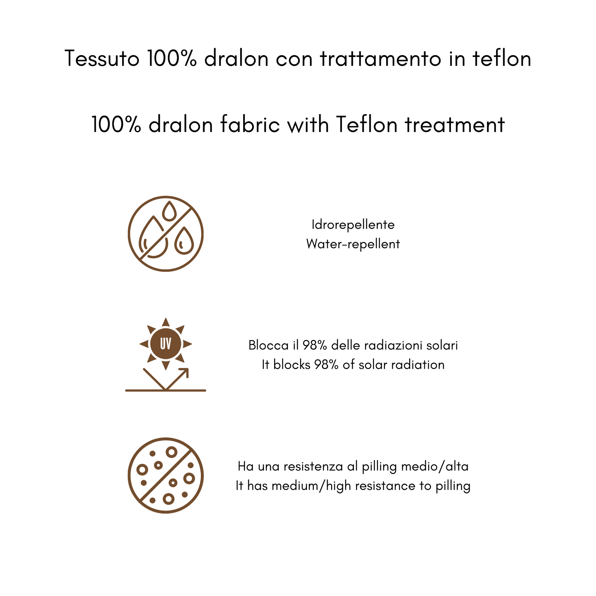 *Il dralon è realizzato in fibra acrilica, molto simile al filato di cotone, non è plastificato al tatto ed è reso dal trattamento in teflon idrorepellente, resistente a sporco e usura.
