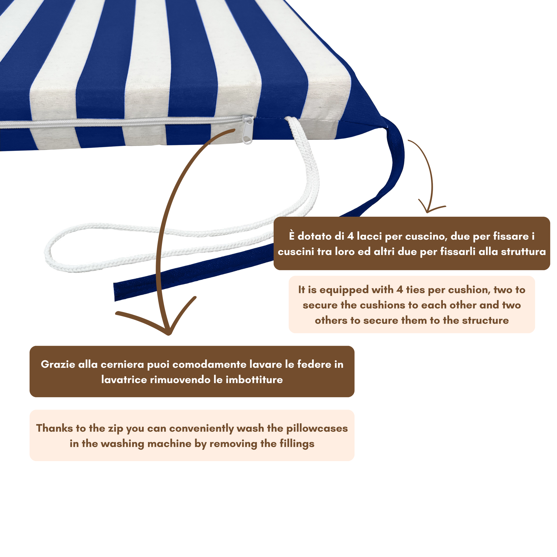 Prodotto artigianale di ottima qualità, corrisponde pedissequamente alla descrizione, ha colori brillanti e molto estivi (la variante bianca e blu si può facilmente abbinare ad altri cuscini, anche colorati) e un valido sistema di lacci che ne assicura la tenuta al dondolo. Ben rifinito e curato nel dettaglio; si può abbinare a dondoli di qualsiasi materiale, dalla formica bianca al legno scuro.