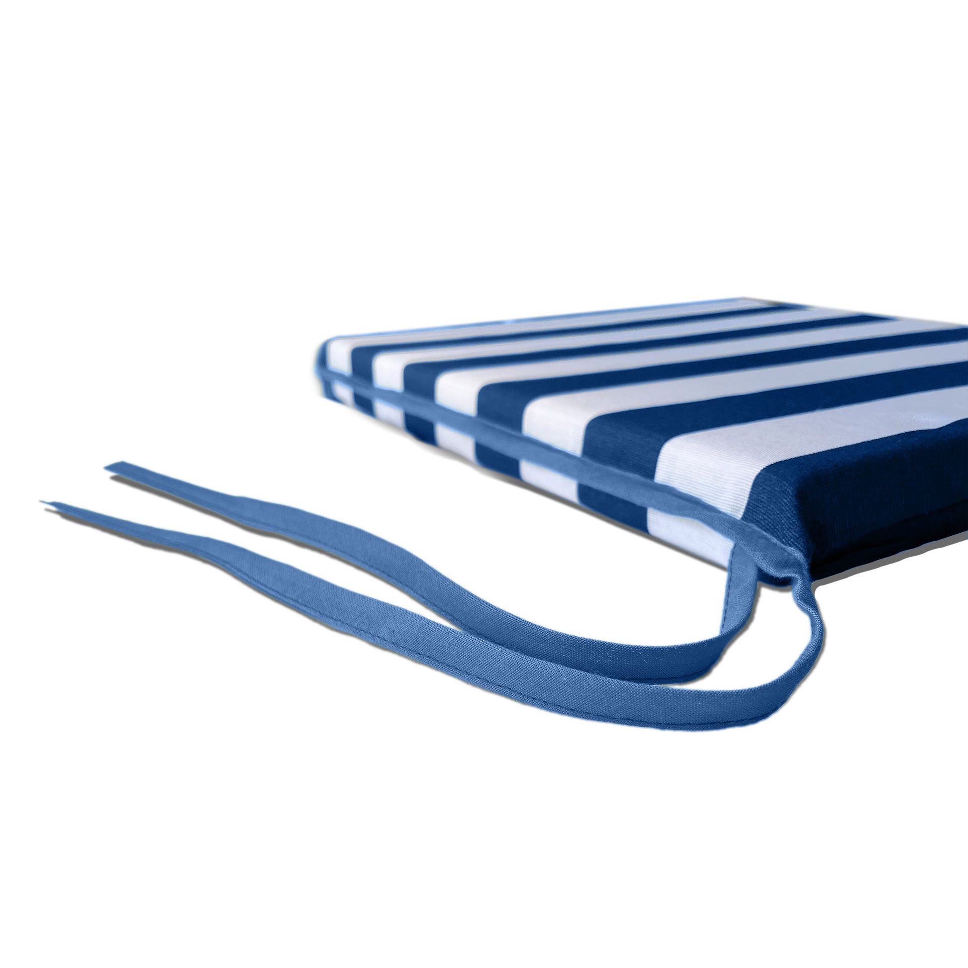 Realizzati in cotone fasciato bianco e blu e imbottiti in spugna, questi cuscini offrono un supporto extra per sedie da cucina e da giardino.