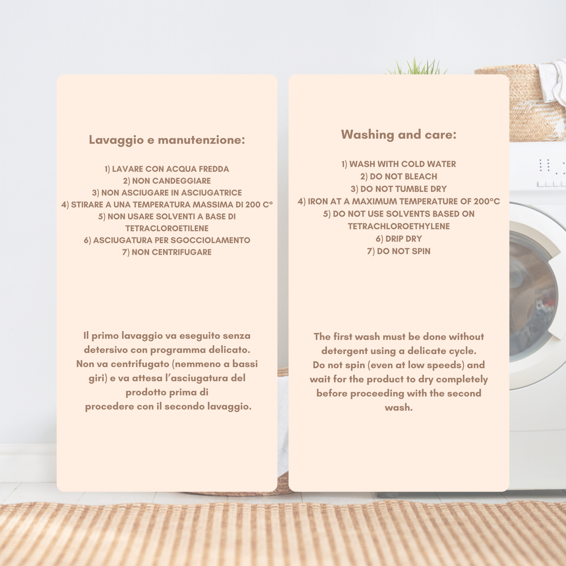 Istruzioni di lavaggio: Lavabile in lavatrice a 30° seguendo attentamente le istruzioni riportate sull'etichetta prima di procedere al lavaggio;