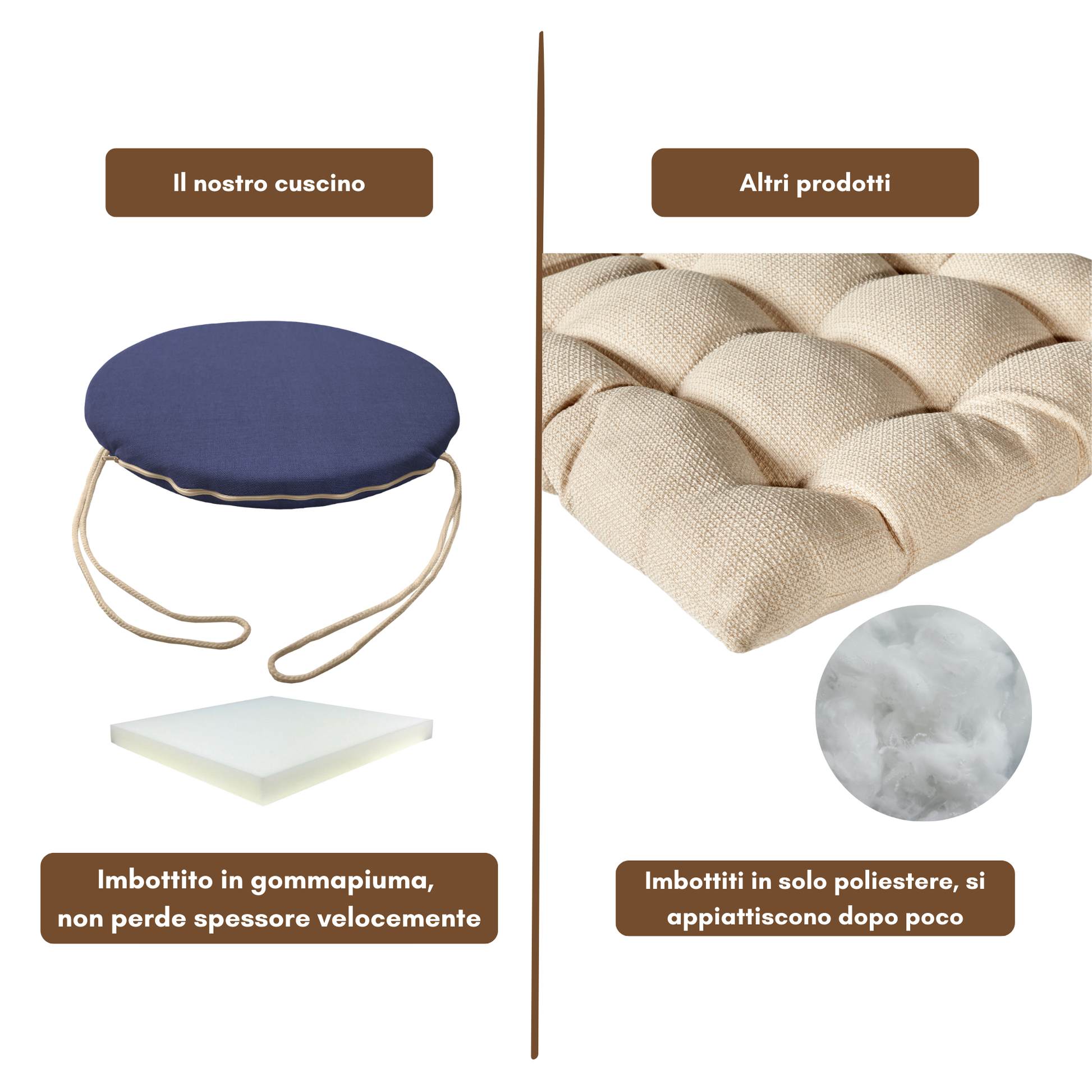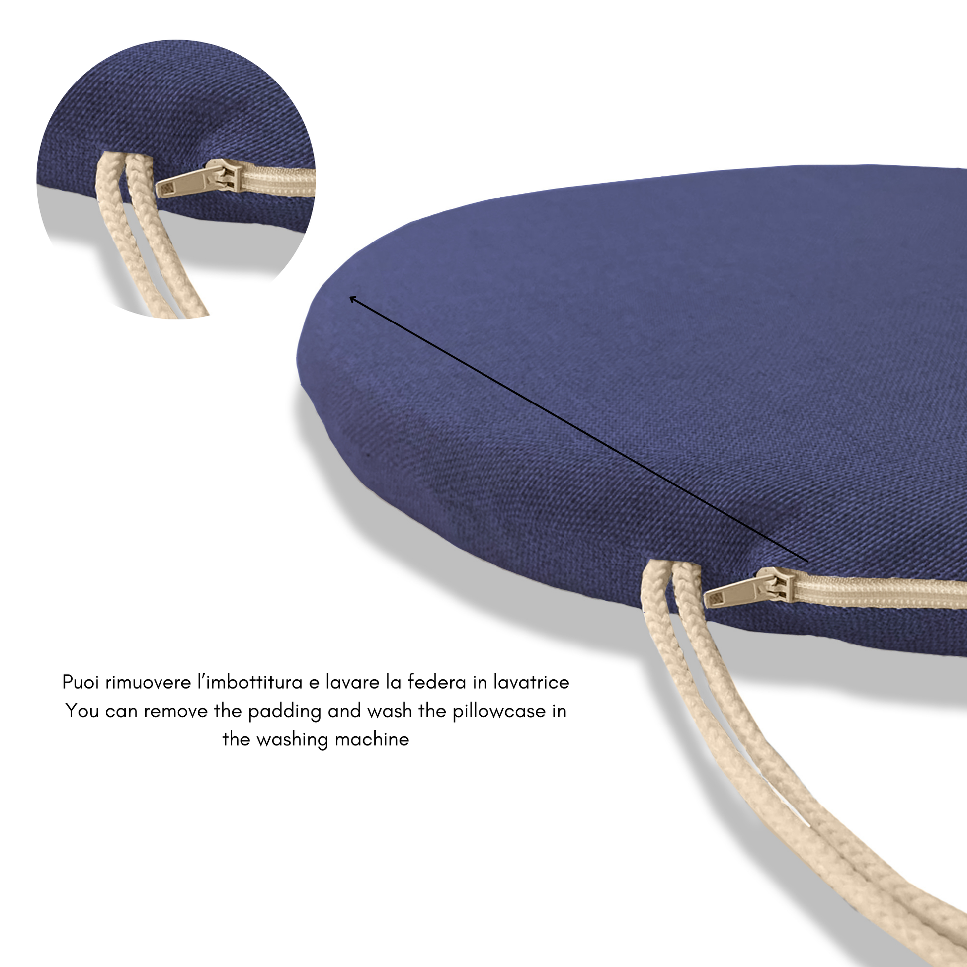 Il nostro cuscino rotondo per sedia è imbottito in soffice e resistente gommapiuma, facilmente rimovibile tramite la cerniera lampo.