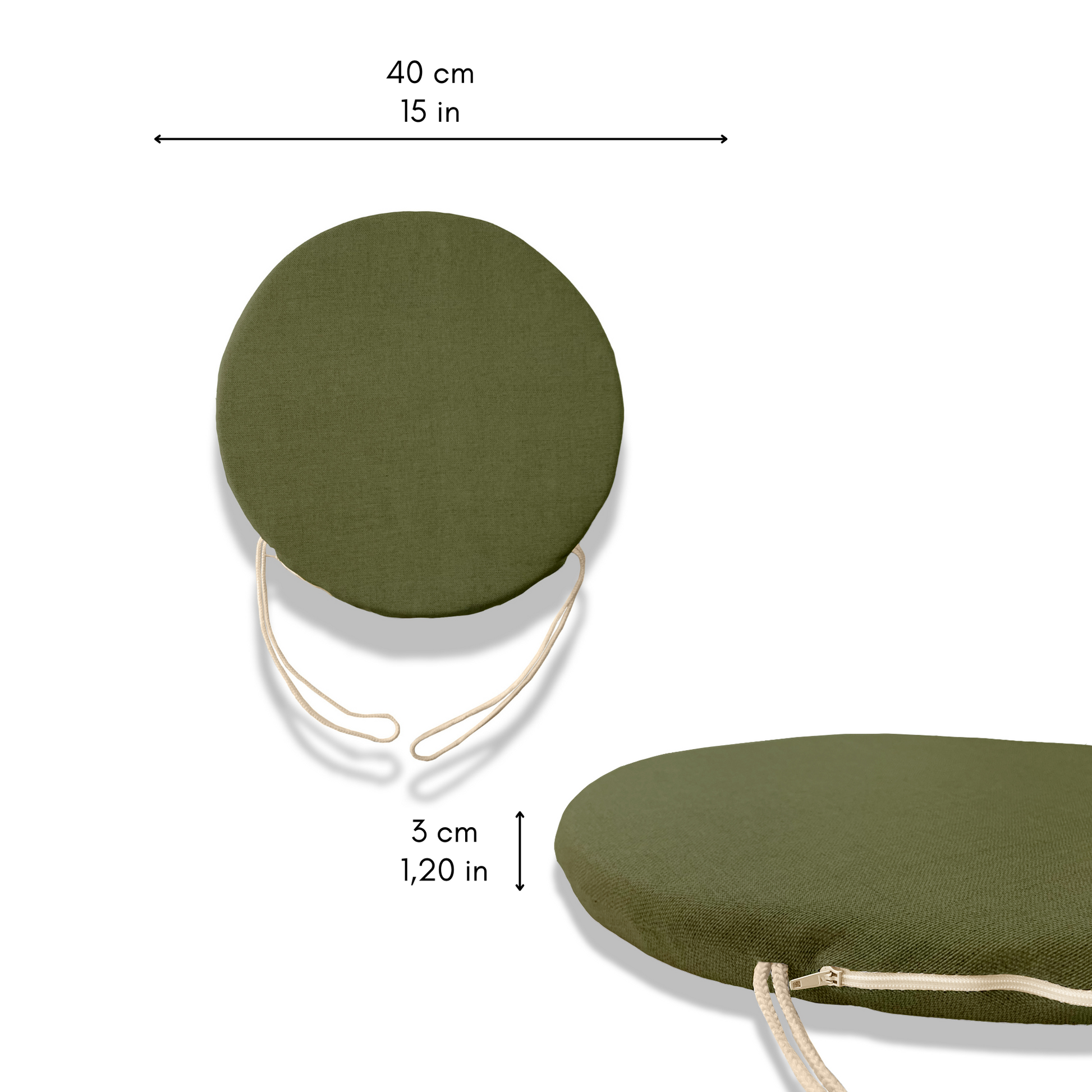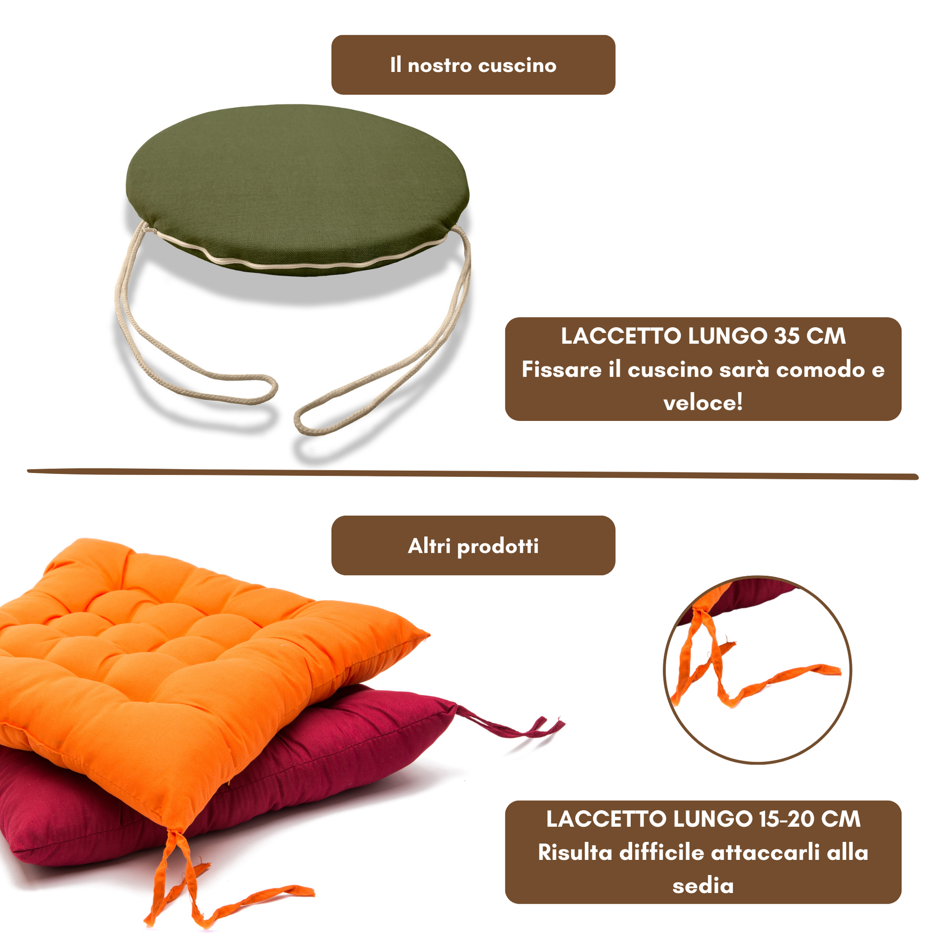 Riceverai 6 cuscini rotondi per sedie rivestiti in tessuto tinta unita 50% cotone e 50% poliestere, disponibili in tante colorazioni diverse.