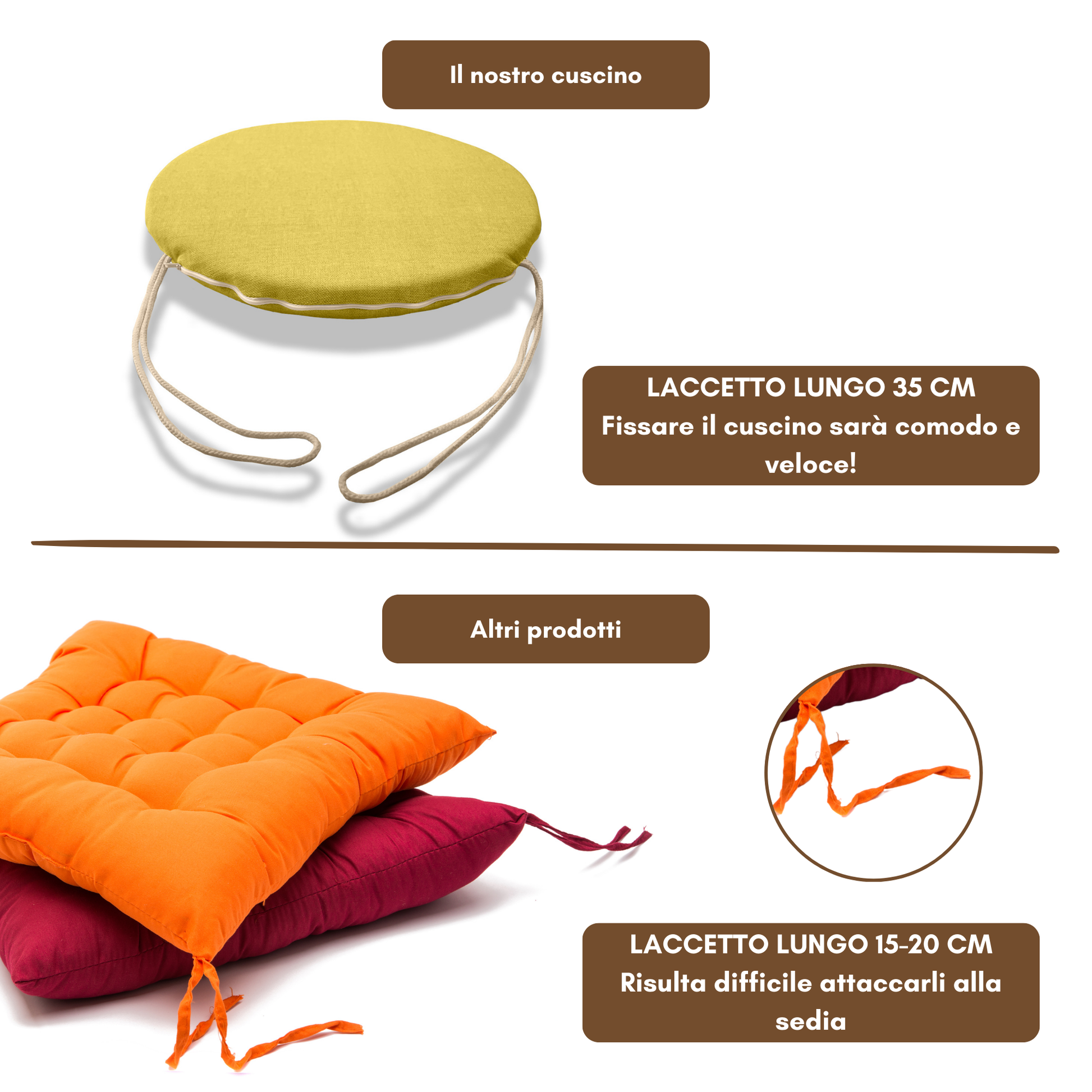 Riceverai 6 cuscini rotondi per sedie rivestiti in tessuto tinta unita 50% cotone e 50% poliestere, disponibili in tante colorazioni diverse.