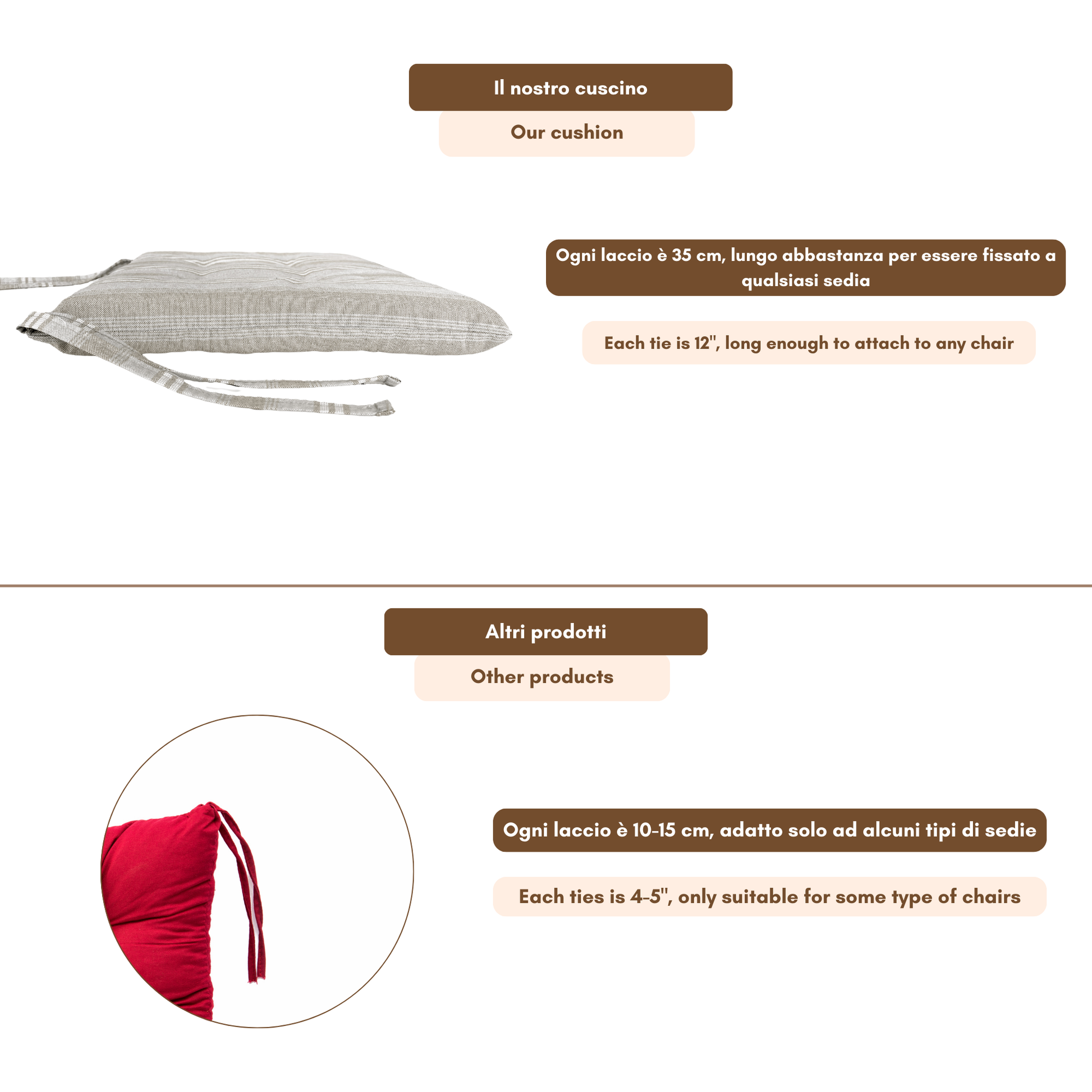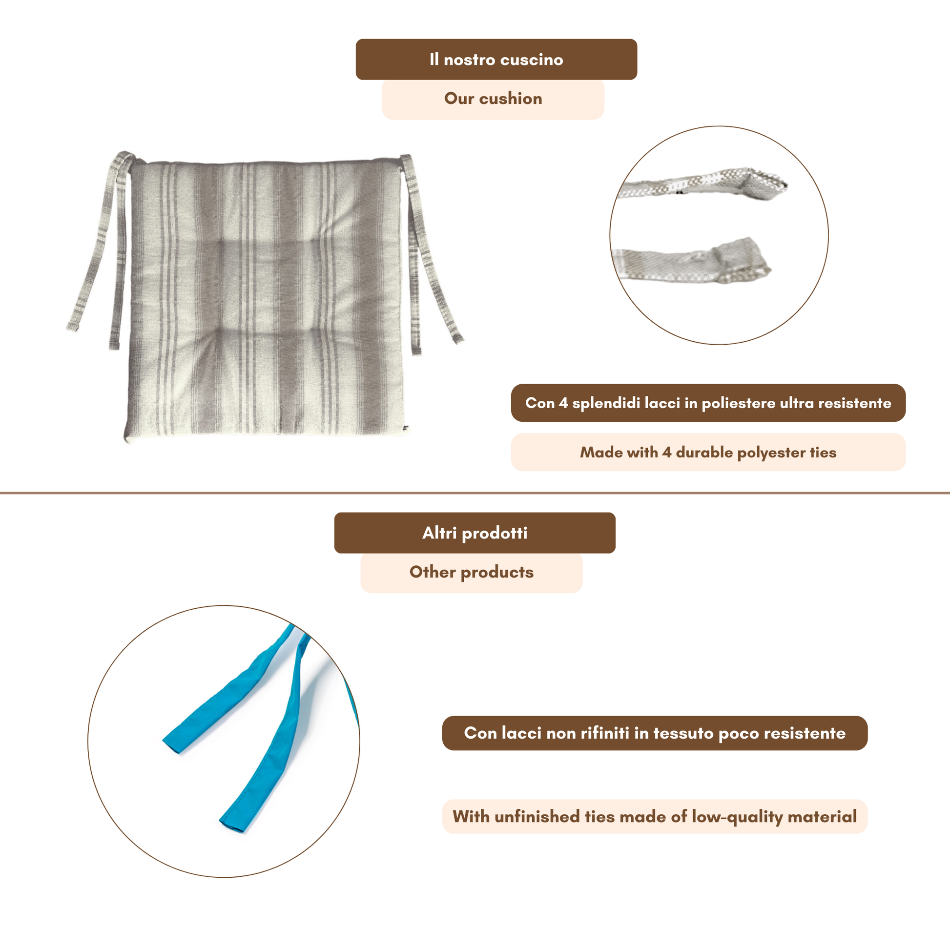 Imbottiti - I nostri cuscini da sedia con laccetti presentano un'imbottitura in gommapiuma dura e resistente ricoperta da un morbido strato di fibra di poliestere che rende la seduta piacevole