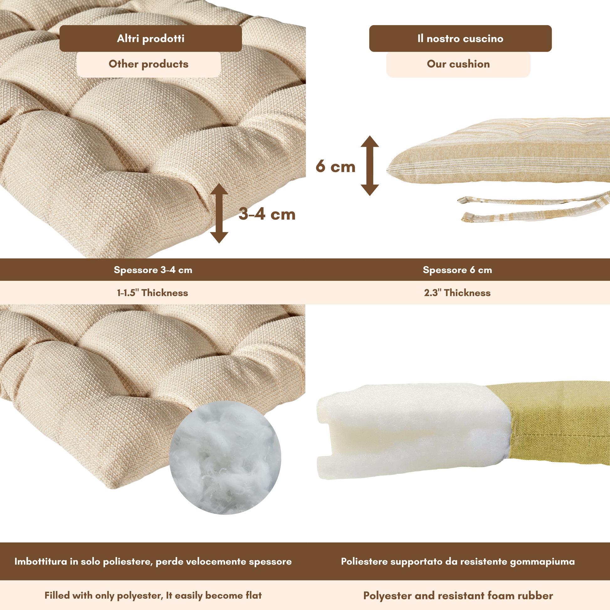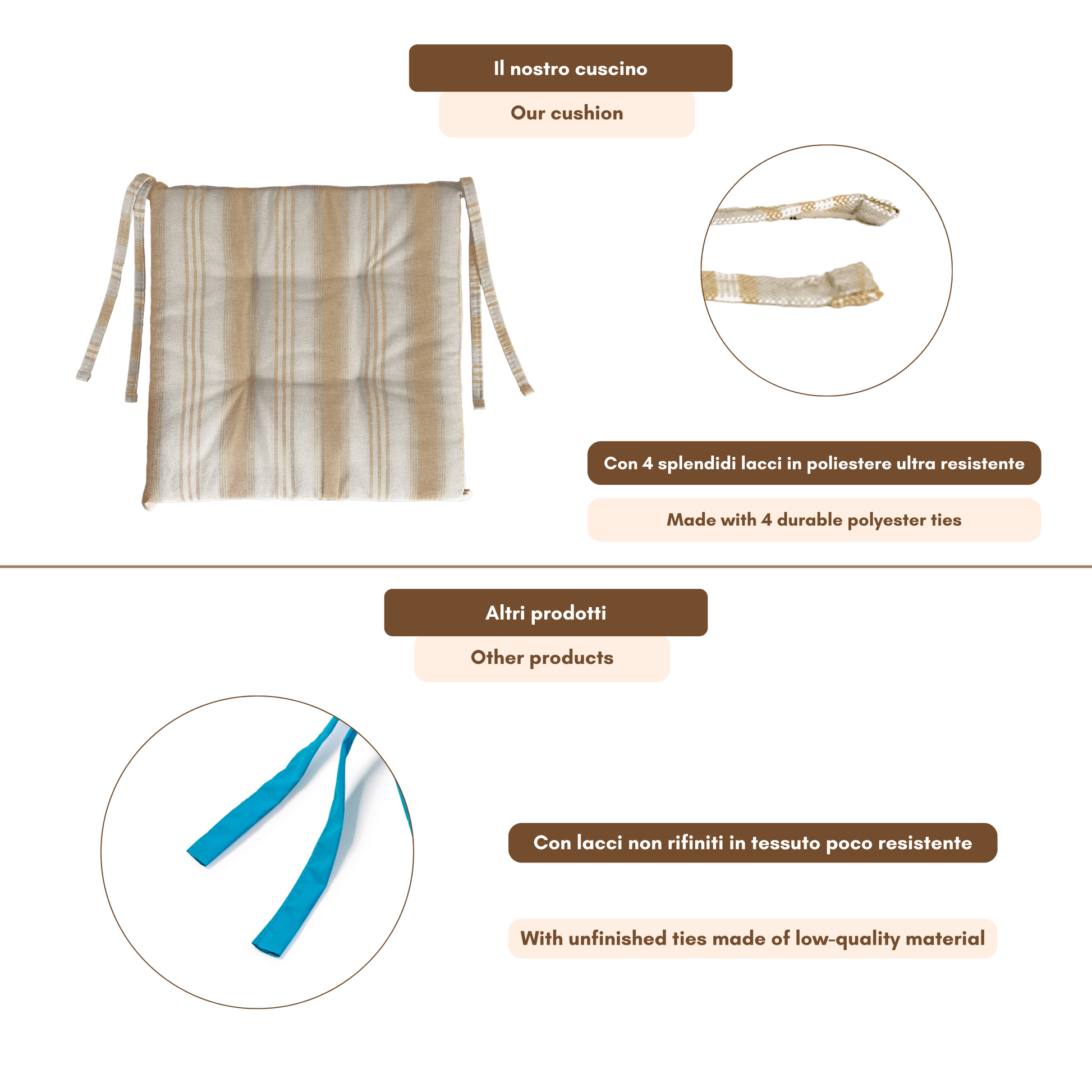 Imbottiti - I nostri cuscini da sedia con laccetti presentano un'imbottitura in gommapiuma dura e resistente ricoperta da un morbido strato di fibra di poliestere che rende la seduta piacevole