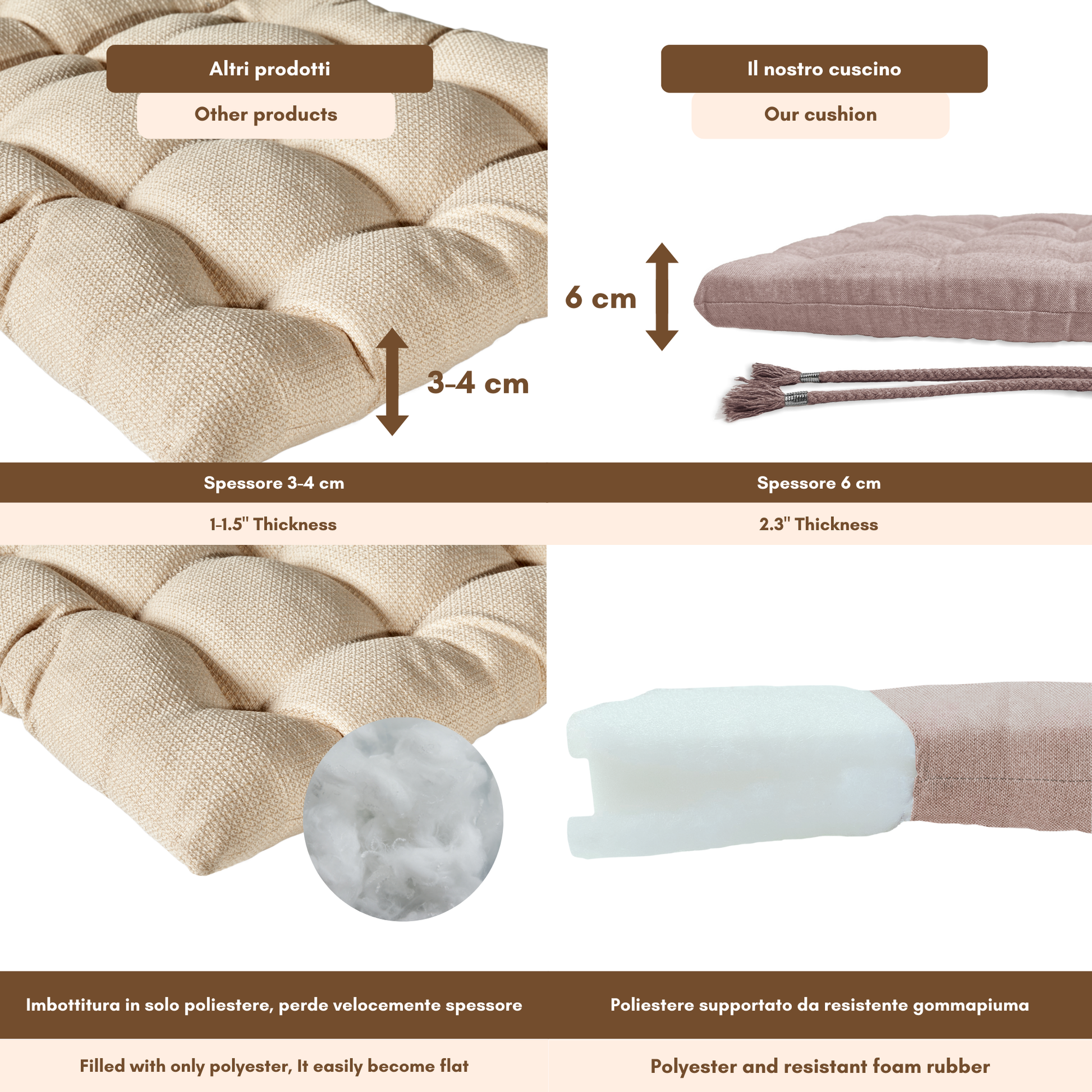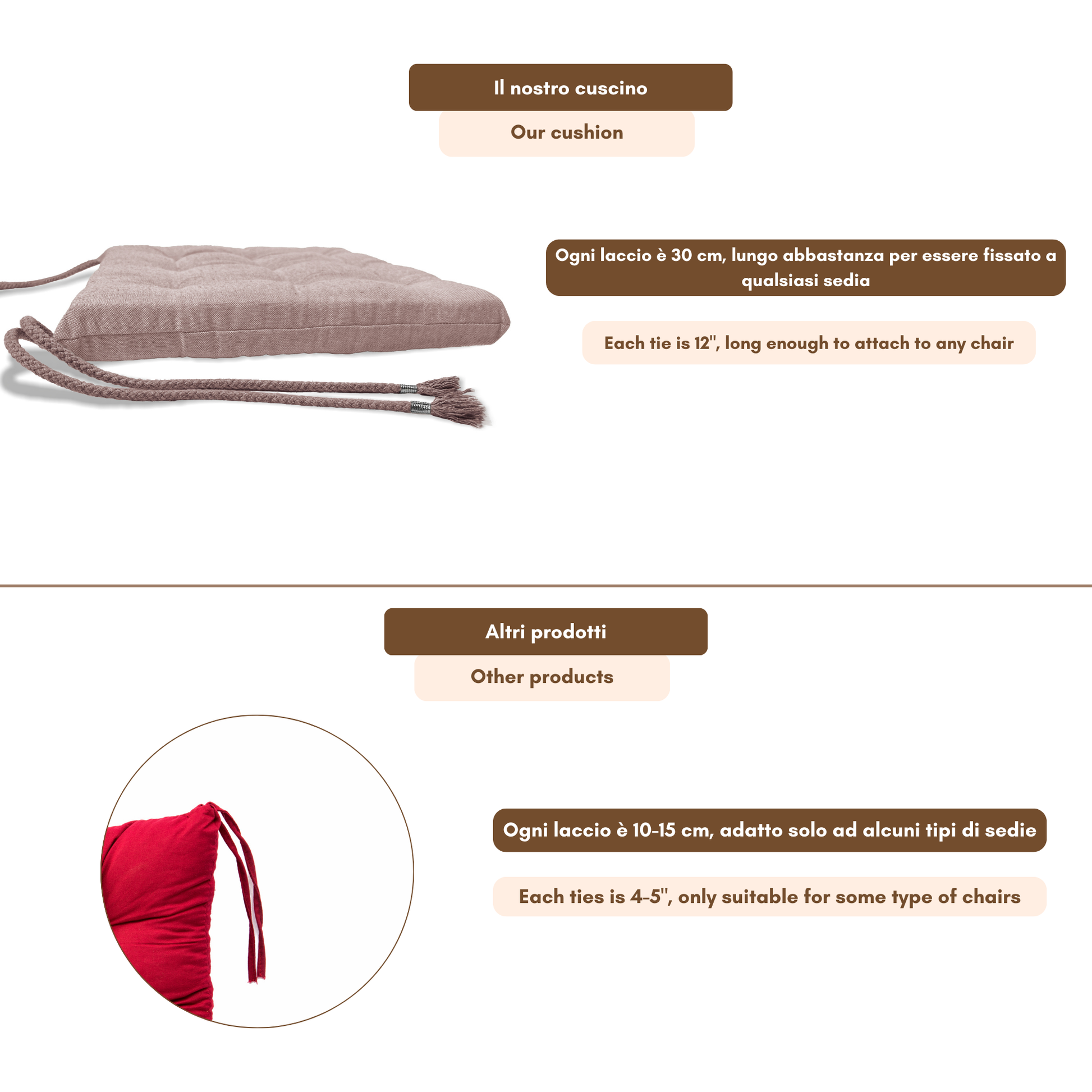 Imbottiti - I nostri cuscini da sedia con laccetti presentano un'imbottitura in gommapiuma dura e resistente ricoperta da un morbido strato di fibra di poliestere che rende la seduta piacevole