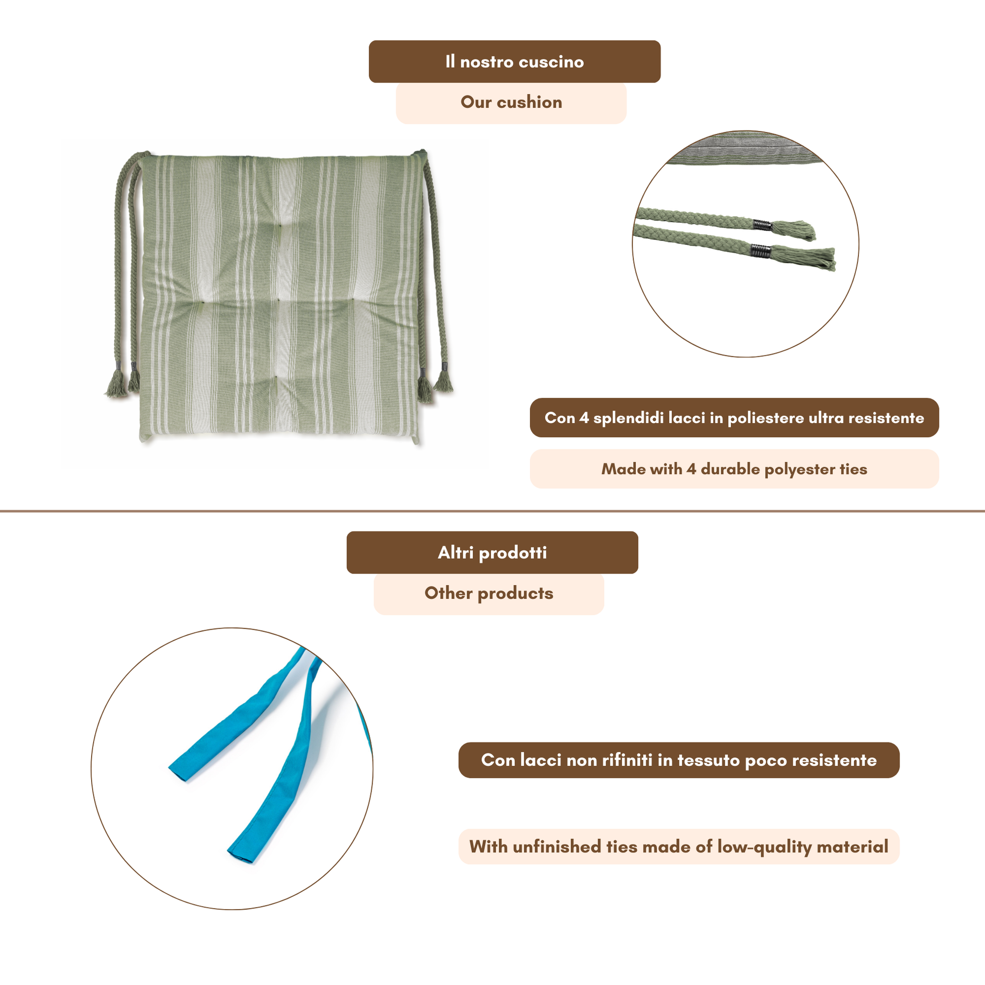 Imbottiti - I nostri cuscini da sedia con laccetti presentano un'imbottitura in gommapiuma dura e resistente ricoperta da un morbido strato di fibra di poliestere che rende la seduta piacevole