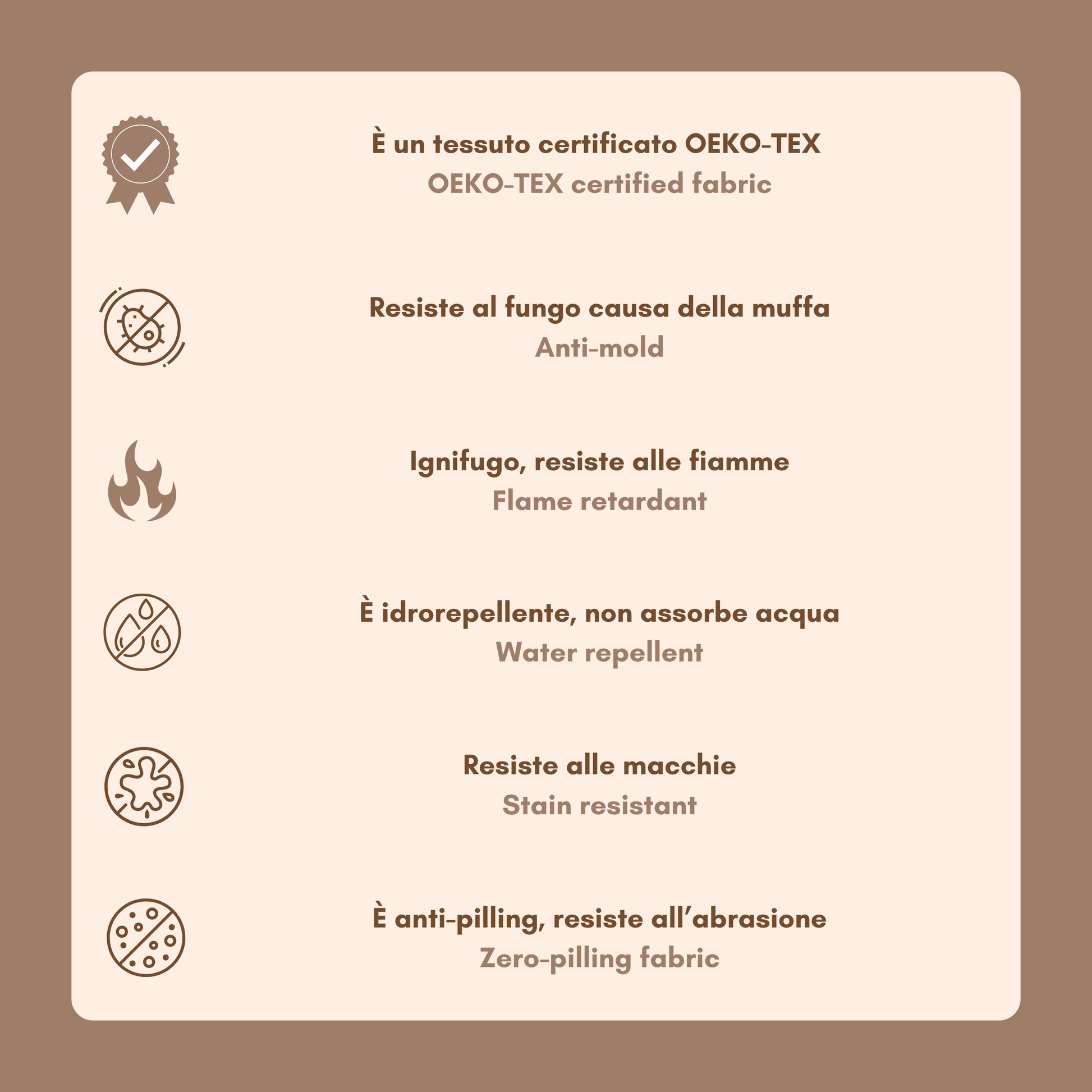 Un tessuto idrorepellente, antimacchia e resistente alla muffa che darà al tuo tavolo una finitura elegante e colori accesi per ravvivare i tuoi pasti.